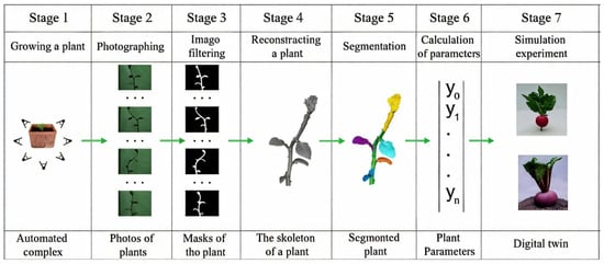 At stages 1–3 of the proposed scheme, non-invasive monitoring of plant growth and development parameters is performed through the collection of photographs taken from various angles. From these images, bit masks are extracted, which are essential for constructing the 3D model. Stages 4–7 involve the process of plant model reconstruction.
