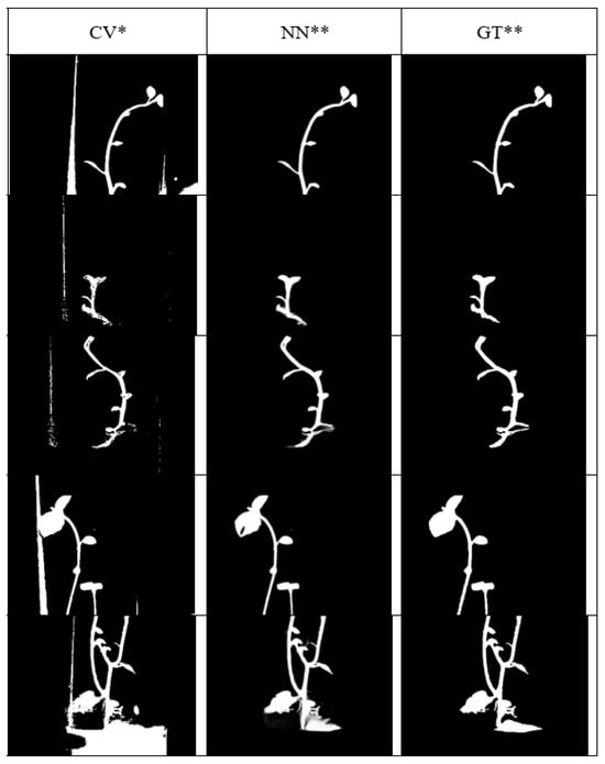 Examples of plant image segmentation using different methods are shown in Figure 2, where *CV represents the bit mask obtained via classical computer vision, **NN denotes the bit mask generated using the U2-Net neural network, and **GT refers to the manually annotated ground truth mask.