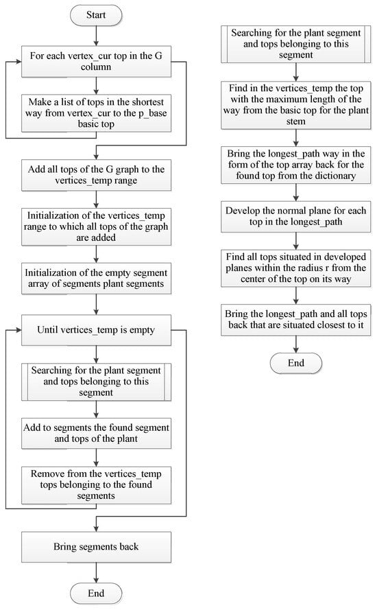 Based on the approaches proposed in Section 3, we have developed a method for determining the morphometric traits of the studied plant, regardless of its structural complexity. This method is presented as an algorithm in Figure 3. A total of 10 parameters of the plants are considered, namely: volume, coordinates of the starting point, coordinates of the endpoint, height, length, surface area of the plant or its parts; as well as maximum and average width, azimuth, and inclination of the plant parts. The volume of the plant or its segments is determined by raising to the third power the product of the number of voxels in a given segment and the size of the voxel: