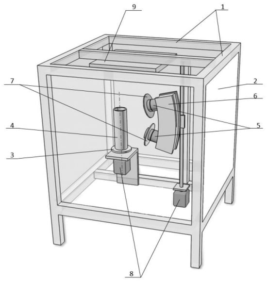 Prototype of the software and hardware complex for conducting experimental research, development, and updating of digital models. 1—Frame; 2—Removable panels; 3—Rotating platform; 4—Container; 5—Photographic and video cameras; 6—Movable platform; 7—Multispectral light sources; 8—Drives; 9—Lighting lamp.