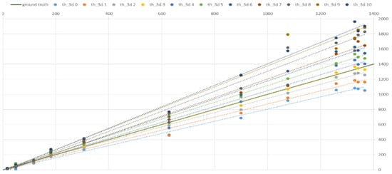 A study of the dependence of the accuracy of determining the volume of plants on the parameter thresh3D showed that the most accurate result is achievable at thresh3D [3,4] (Figure 18).