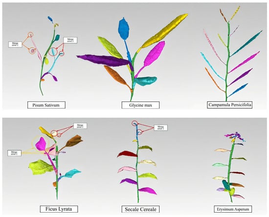The analysis of the obtained data allows us to conclude that the segmentation algorithm performs better with plants that have a simple branching system, where all leaves grow from the main stem, such as Ficus lyrata, Cabbage, and Carrot. In plants with a complex branched system, segmentation errors are more common due to the fact that the total number of points in some neighboring segments is greater than the threshold and such segments are combined into one.