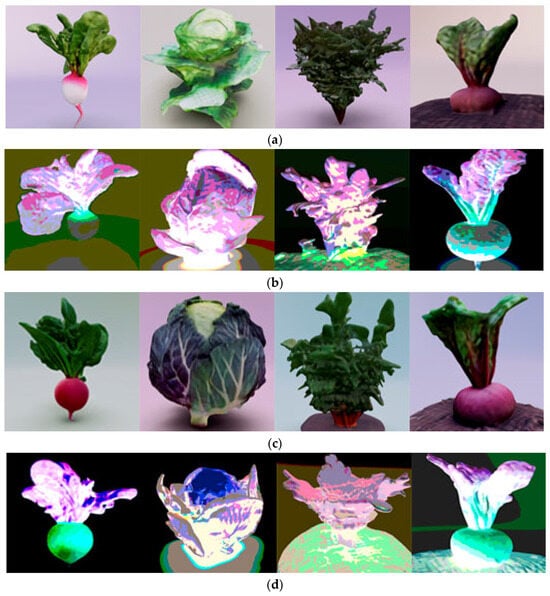 The visualization of the growth and development of root and stem crops is shown in Figure 20 at different CO2 concentrations of 0.015–0.03% (Figure 20a) and 0.07–0.09% (Figure 20b). The 3D models are presented in raster format with overlaid textures. Figure 20c,d also display images of the crops in the visible spectrum at the investigated CO2 concentrations.