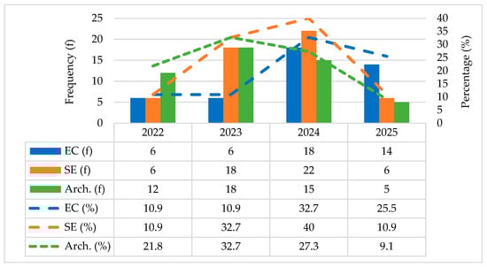 Frequency and % of students in each degree program who began using GenAI by year. Notes: EC (Early Childhood Education), SE (Social Education), and Arch. (Architecture). The % were calculated based on the total number of participants (N = 55 in each degree program).