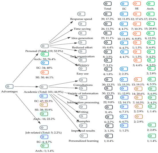 Frequency and % of undergraduate students who stated advantages when using GenAI. Notes: EC (Early Childhood Education), SE (Social Education), and Arch. (Architecture). The percentages were calculated based on the total number of answers in each group for this main category.