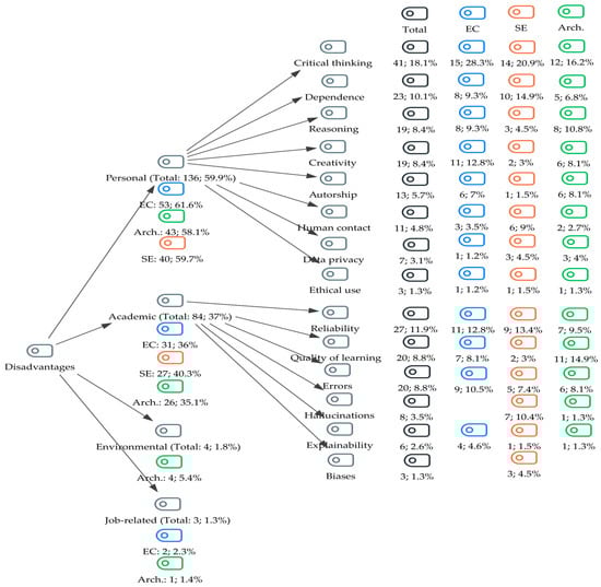 Frequency and % of undergraduate students who stated disadvantages when using GenAI. Notes: EC (Early Childhood Education), SE (Social Education), and Arch. (Architecture). The percentages were calculated based on the total number of answers in each group for this main category.