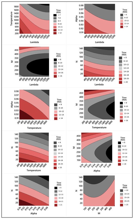 The contour plots in Figure 4 show that there is a relationship between the values of the hyperparameters. For lambda, small values influenced the hybrid SA algorithm’s ability to yield feasible solutions, especially in the aircraft landing problem with time windows in which a single change in the aircraft sequence could produce infeasible solutions. For our datasets, Lambda must have a value greater than 600. The temperature parameter was linked to the probability of accepting a worse solution to escape local minima. For the studied problem, the temperature must be higher than 1400. The alpha parameter controlled the temperature cooling factor. In the present case, alpha must be greater than 0.97, indicating that the temperature must be slowly reduced. The results also showed that the algorithm performed better when it maintained a certain temperature for longer (parameter N). The temperature change range (parameter M) was between the extreme values surveyed.