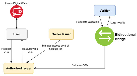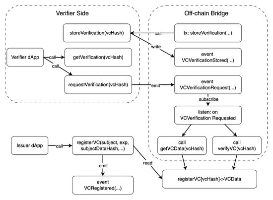 Figure 3 illustrates the structure of the smart contract architecture and its interaction with the off-chain bridge, detailing how verification requests, event emissions, and on-chain state updates flow across the issuer and verifier networks.