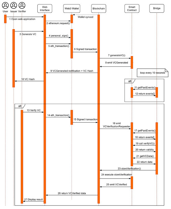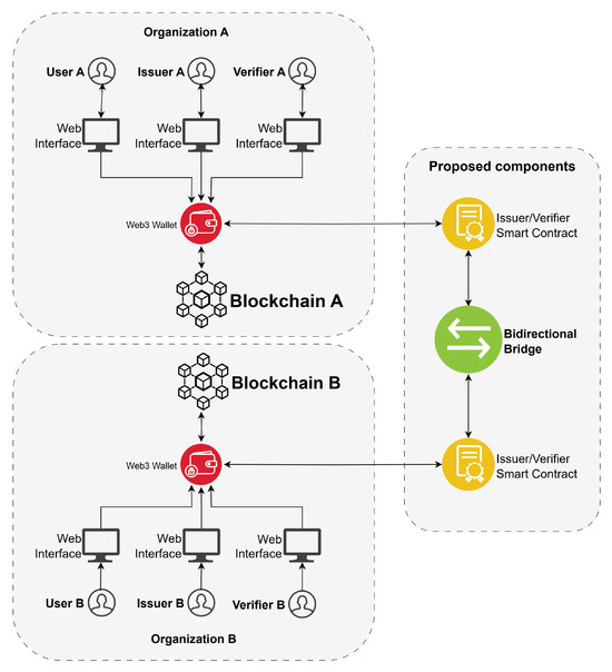 Figure 2 illustrates the main components of an application responsible for issuing and checking VCs. It highlights user interaction, the web interface of the decentralized application (dApp), web3 wallet, smart contracts, and a bidirectional bridge that connects two private blockchain networks.