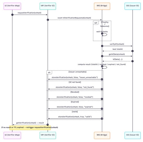 Figure 5 presents the complete runtime sequence of a cross-chain verification request, showing how the verifier dApp, the verifier smart contract, the off-chain bridge service, and the issuer smart contract interact to produce an auditable verification result. The diagram illustrates the event-driven workflow triggered by a request on the verifier’s blockchain, the bridge’s finality-aware handling of emitted events, and the retrieval of credential status from the issuing chain through view calls. It also highlights the decision logic applied by the bridge to classify a credential as valid, revoked, expired, not found, or unreachable, followed by the on-chain storage of the verification outcome for auditability.