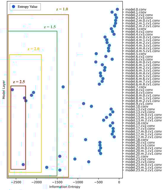 Figure 2 visualizes the entropy values across 59 layers, with the horizontal axis showing the raw entropy values and the vertical axis listing the convolutional layers of the network. Colored rectangles indicate the outlier detection results at different z-score thresholds. The z-scores corresponding to these rectangles are labeled as , , , and , highlighting the detected outliers for each threshold.