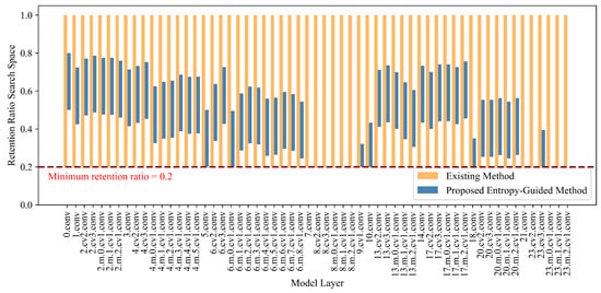 In contrast, the proposed method uses an entropy-based approach for each layer, depicted by the blue bar on the right. Layers with higher entropy values are assigned both upper and lower bounds at higher retention ratios, reflecting their richer information content and the need to preserve more filters. Conversely, layers with lower entropy are assigned proportionally smaller search intervals. As a result, the search range naturally adapts to each layer’s importance, and the dashed red line at 0.2 indicates the common lower limit below which neither bar can drop.