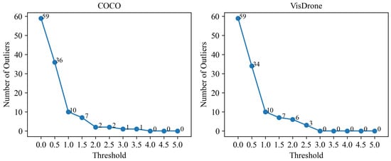 The core idea of EGSSO is to guide pruning ratios according to the layer-wise entropy values, but outlier detection can further refine these entropy values by removing anomalous measurements that could distort the min–max normalization. To assess this, several z-score thresholds () are tested in detecting outlier entropy values. A smaller threshold flags more entropy values as outliers, while a larger threshold is more lenient. Figure 7 reports how many entropy values are deemed outliers at each threshold on COCO (left) and VisDrone (right).