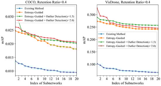 To examine how outlier detection contributes to final subnetwork quality (before fine-tuning), four configurations are compared: (1) existing random pruning, (2) entropy-guided without outlier detection, (3) entropy-guided with , and (4) entropy-guided with . Subnetworks are ranked by mAP, and the top 20 are displayed in Figure 8 for COCO (left) and VisDrone (right) at a pruning retention ratio of 0.4.