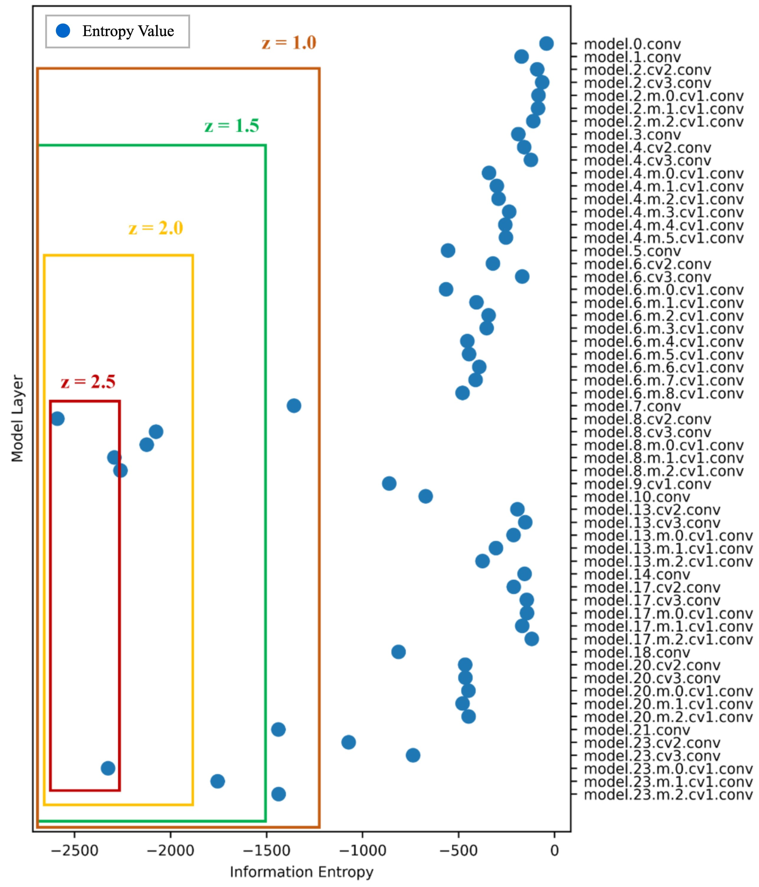 The original information entropy values with outliers marked. Each row corresponds to one of the layers of the model, and the horizontal axis shows its raw layer-wise information entropy. The colored rectangles mark entries flagged as outliers under different z-score thresholds, illustrating that the thresholds isolate only a few extreme outlier layers.
