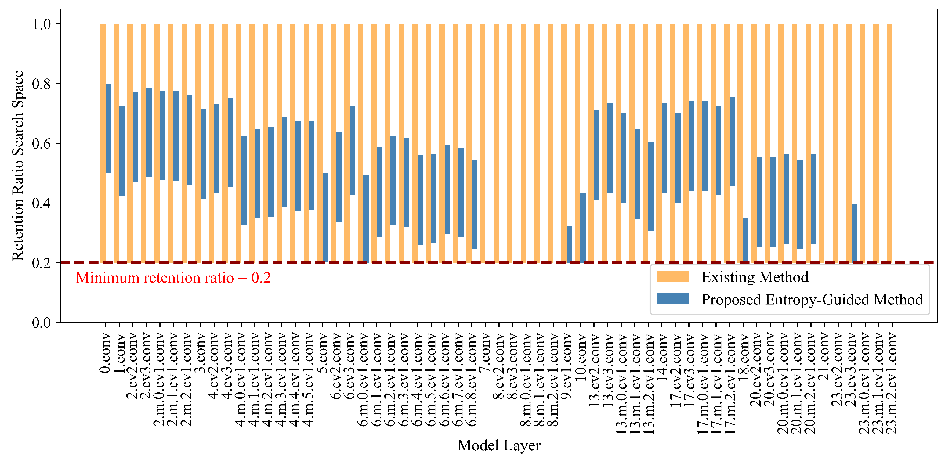 Comparison of search spaces. For each of the layers in model, the orange bar shows the existing uniform space and the blue bar shows our entropy-guided bounds derived from normalized entropies. Layers with higher normalized entropy receive higher and narrower bounds, whereas low entropy layers receive proportionally lower intervals; the dashed red line denotes the common lower limit. Our restriction steers sampling toward more promising subnetworks, improving search efficiency and higher network performance.
