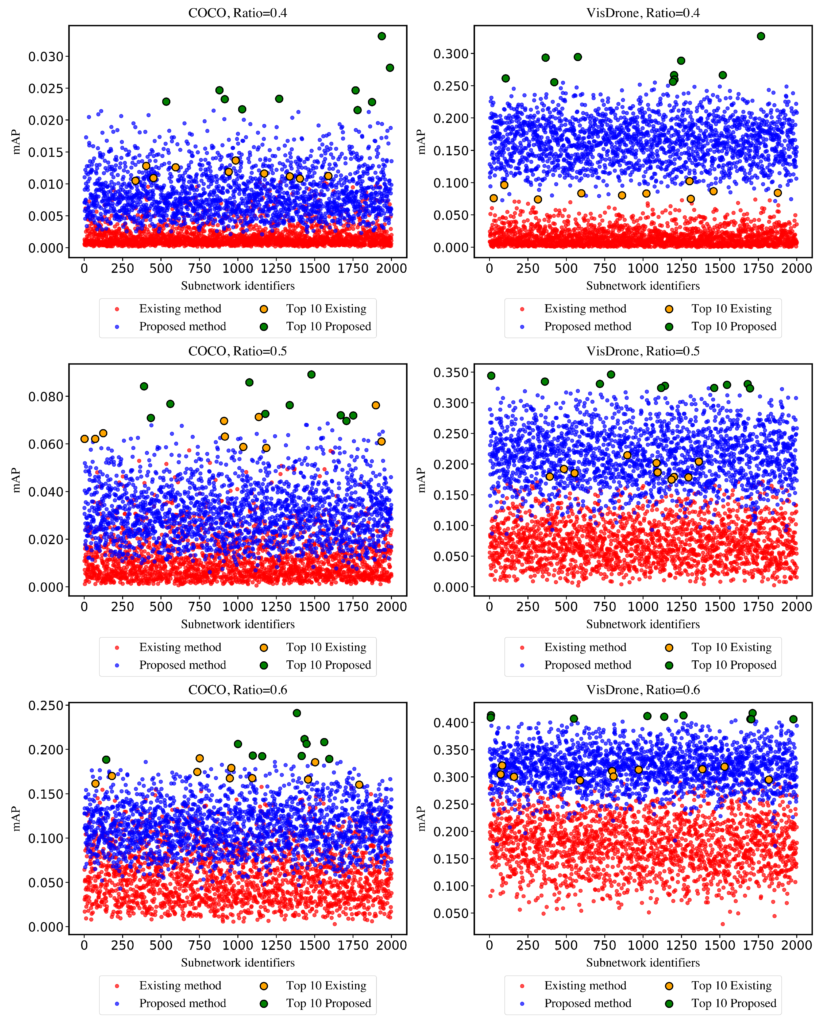 Scatter plots of subnetwork mAP values at pruning retention ratios of 0.4, 0.5, and 0.6 on the COCO and VisDrone datasets. Each point corresponds to one sampled subnetwork (horizontal axis: subnetwork identifier; vertical axis: mAP). Green markers denote the top-10 subnetworks discovered by the existing method, while gold markers highlight the top-10 subnetworks obtained by the proposed EGSSO.