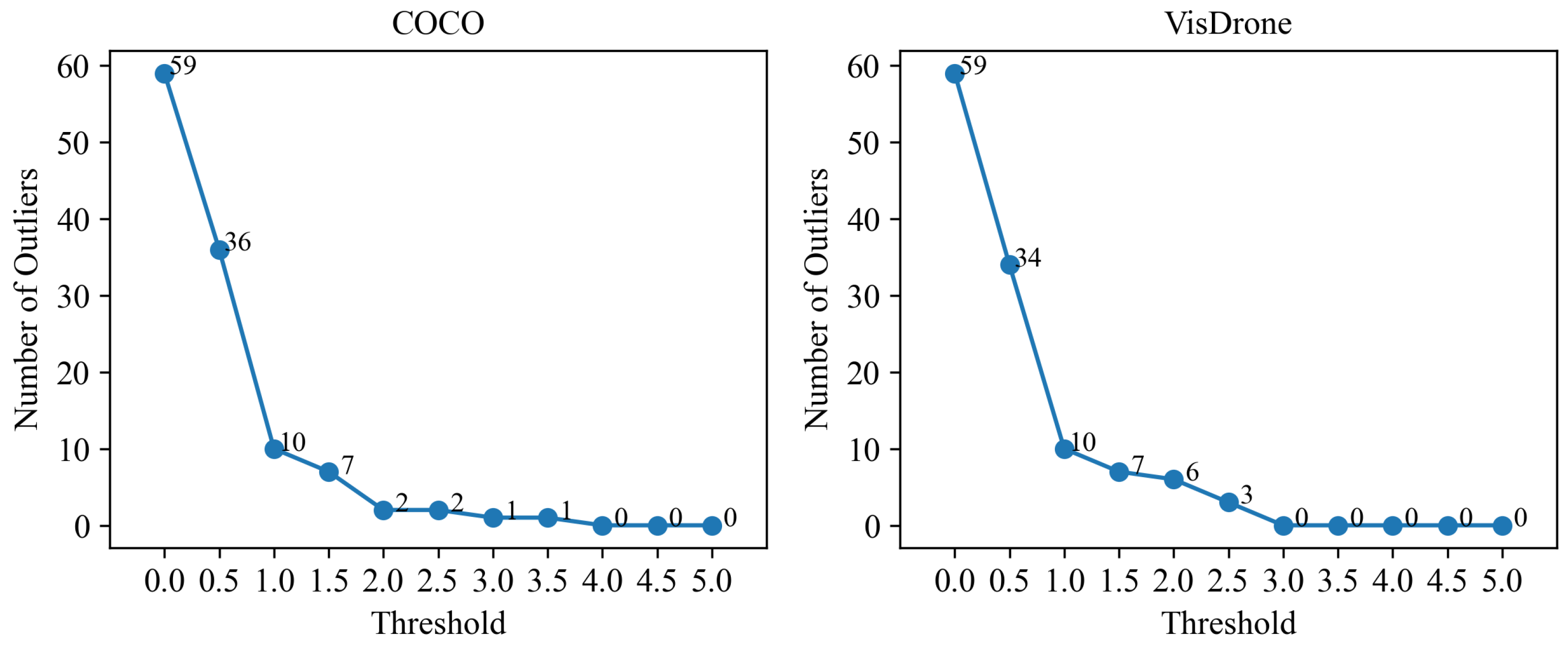 Number of entropy values flagged as outliers under different z-score thresholds in datasets COCO (left) and VisDrone (right).
