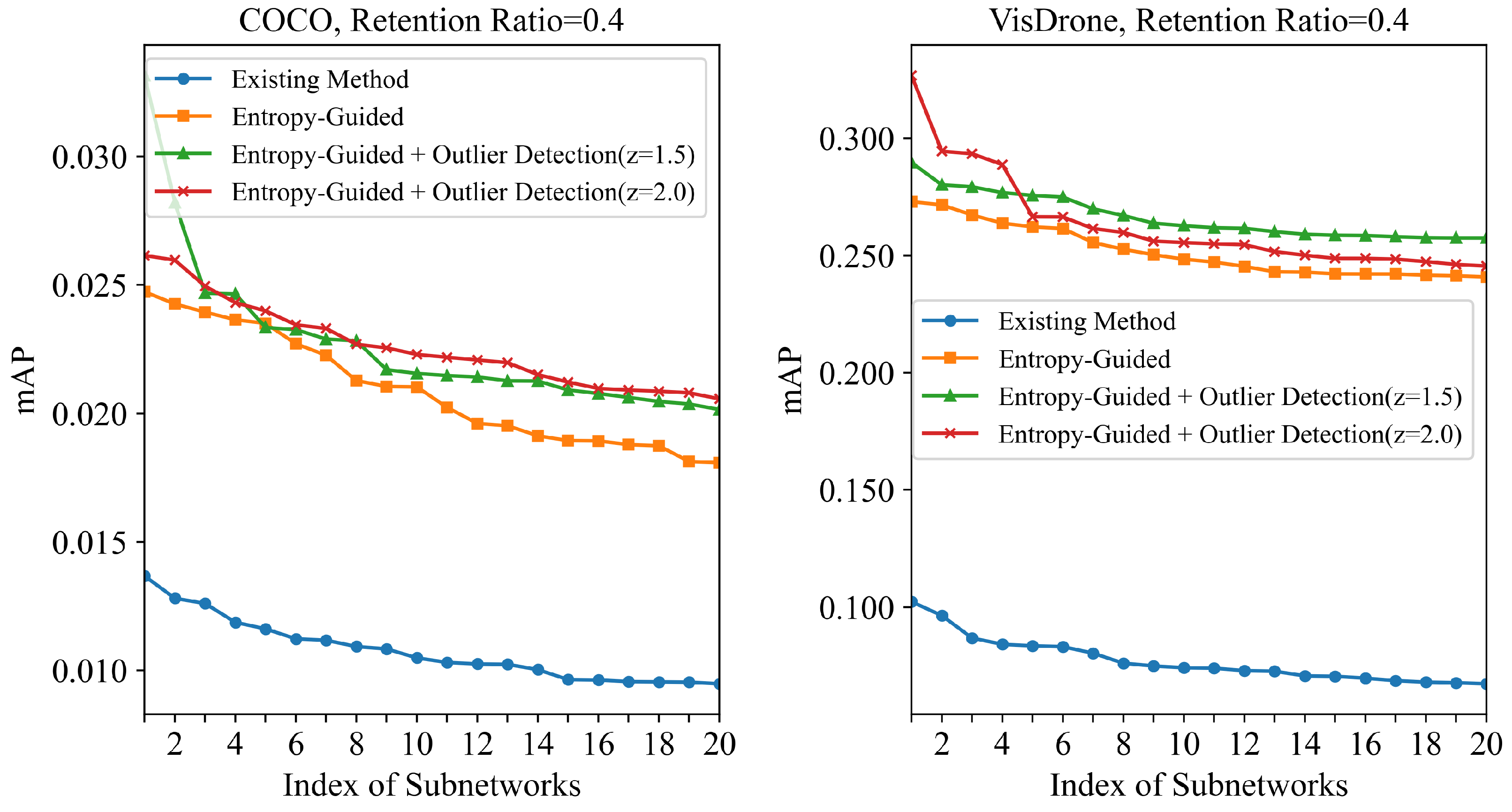 Top-20 subnetworks (before fine-tuning) at a retention ratio of 0.4 for COCO (left) and VisDrone (right) under different configurations.