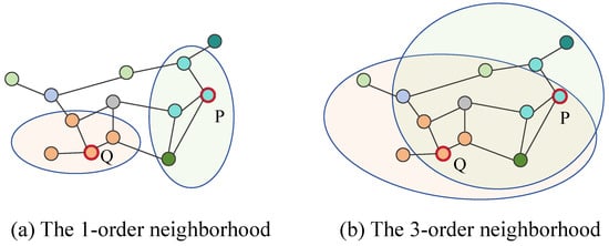 The neighboring nodes vary with different orders. Nodes P and Q have different first-order neighbors. In the third-order neighborhood, nodes P and Q share overlapping neighbors, and the number of neighboring nodes increases substantially.