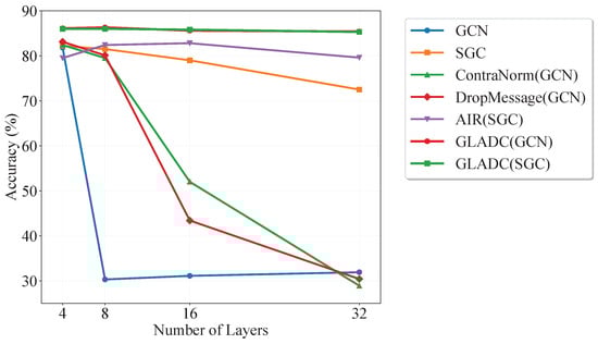In terms of the optimal depth range, traditional GCN/SGC typically reach their best accuracy at 4–8 layers and rapidly degrade afterward. In contrast, GLADC maintains near-optimal performance at 16–32 layers, clearly demonstrating its ability to overcome the depth-induced performance collapse. These findings confirm that GLADC not only alleviates the over-smoothing problem but also enables GNNs to scale to deeper architectures while preserving or even improving classification accuracy.