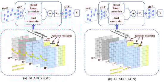 GLADC consists of a global linear attention mechanism and a dual constraint module, as illustrated in Figure 3. The global linear attention mechanism enables efficient propagation of information across the entire graph, while the dual constraint module incorporates both random masking and contrastive constraint to mitigate over-smoothing and enhance local feature discrimination. Specifically, random masking is applied along the column-wise dimension of the representation matrix, while contrastive constraint is imposed along the row-wise dimension. These mechanisms are integrated into both SGC and GCN backbones to promote diverse and stable node representations.