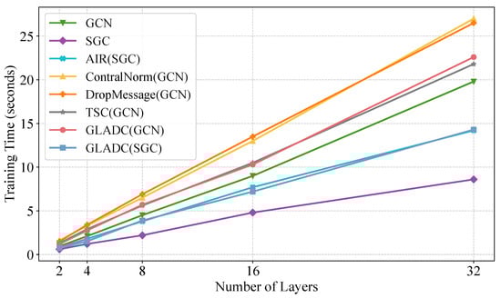 To assess the computational efficiency of GLADC, we compared its total training time against several baseline models on the Cora dataset across varying depths (2, 4, 8, 16, and 32 layers). The results are visualized in Figure 4.