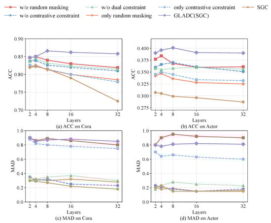 While individual constraint mechanisms offer measurable benefits, they provide only incomplete protection against over-smoothing. The “only contrastive constraint” variant maintains relatively better MAD values but suffers significant accuracy degradation in deeper layers, whereas the “only random masking” variant shows more stable accuracy preservation but achieves limited feature distinctiveness. This performance pattern clearly indicates that neither constraint mechanism alone is sufficient for achieving optimal performance in deep graph networks.