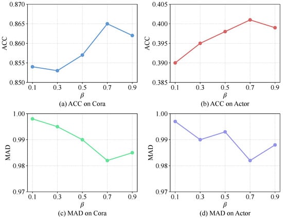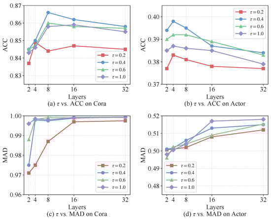 To further evaluate the robustness of GLADC, we conducted a systematic sensitivity analysis on three key hyperparameters: (global attention residual weight in Equation (4)), (masking decay rate in Equation (6)), and (contrastive temperature in Equation (7)). We focused on two representative datasets, Cora and Actor, to examine the influence of these parameters on the GLADC(SGC) model. The evaluation metrics include test classification accuracy (ACC) and Mean Average Distance (MAD), which jointly reflect the model’s classification performance and its resistance to over-smoothing.