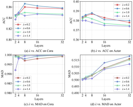 The experimental results are comprehensively analyzed in Figure 5. The results, measured by classification accuracy (ACC) and Mean Average Distance (MAD, where MAD = 0 indicates complete over-smoothing), yield the following critical insights.