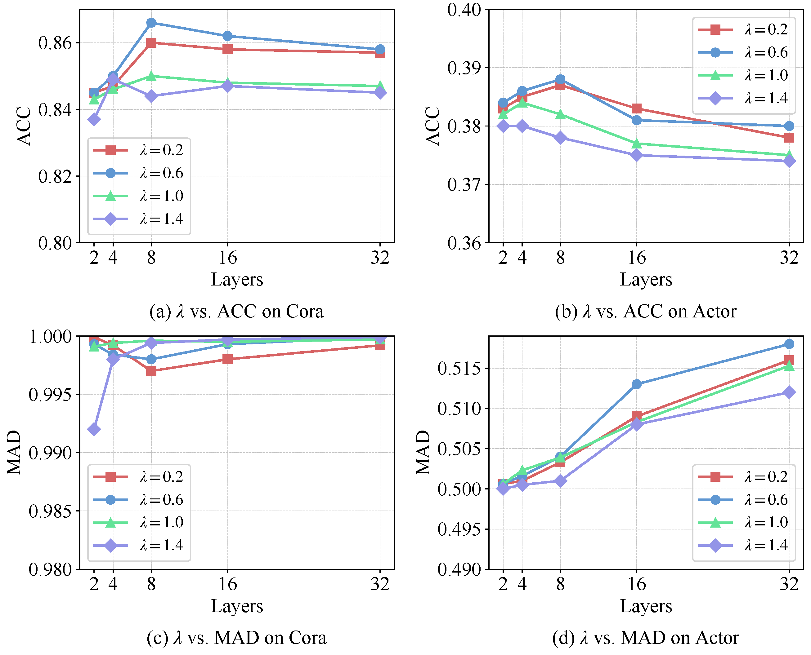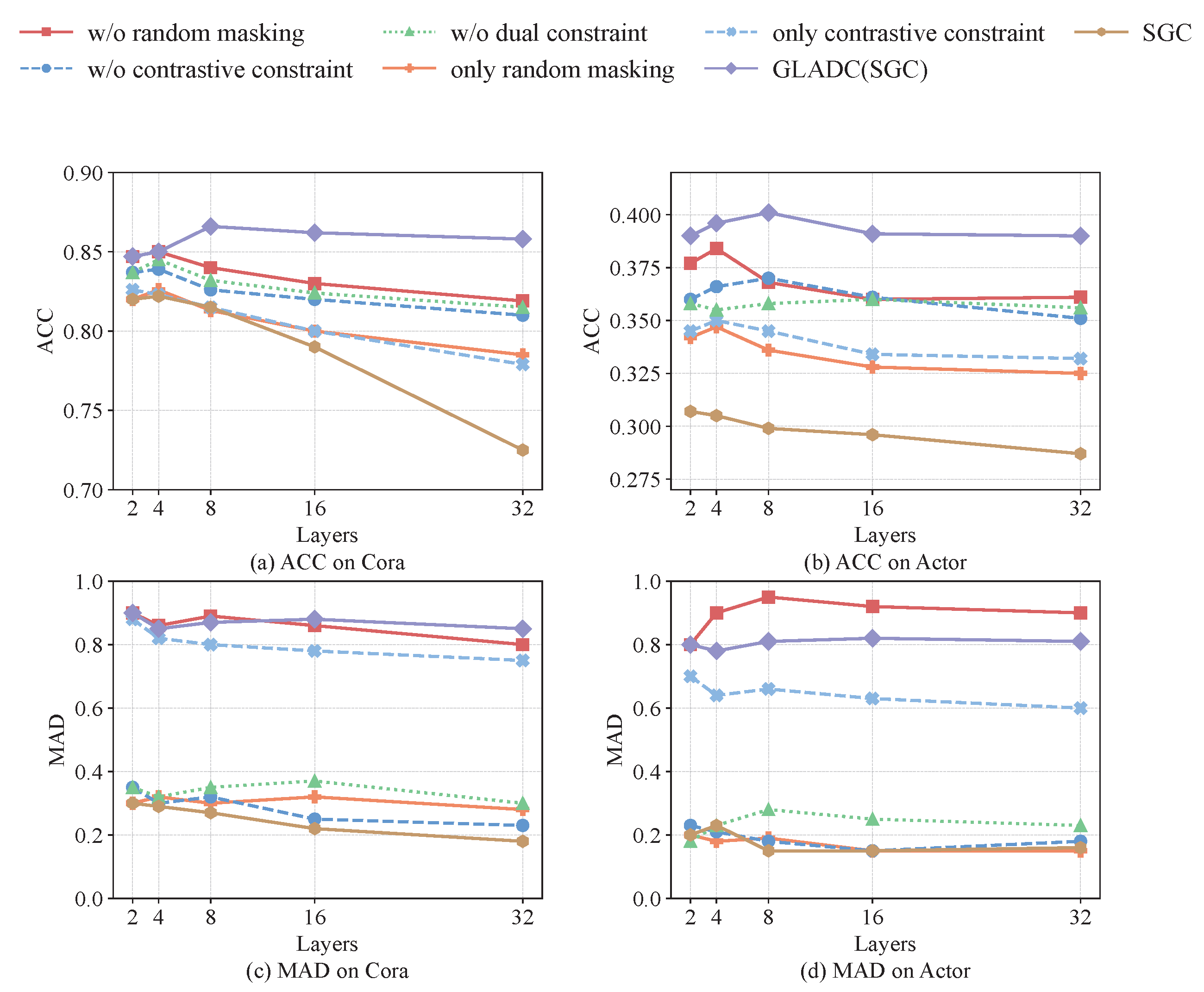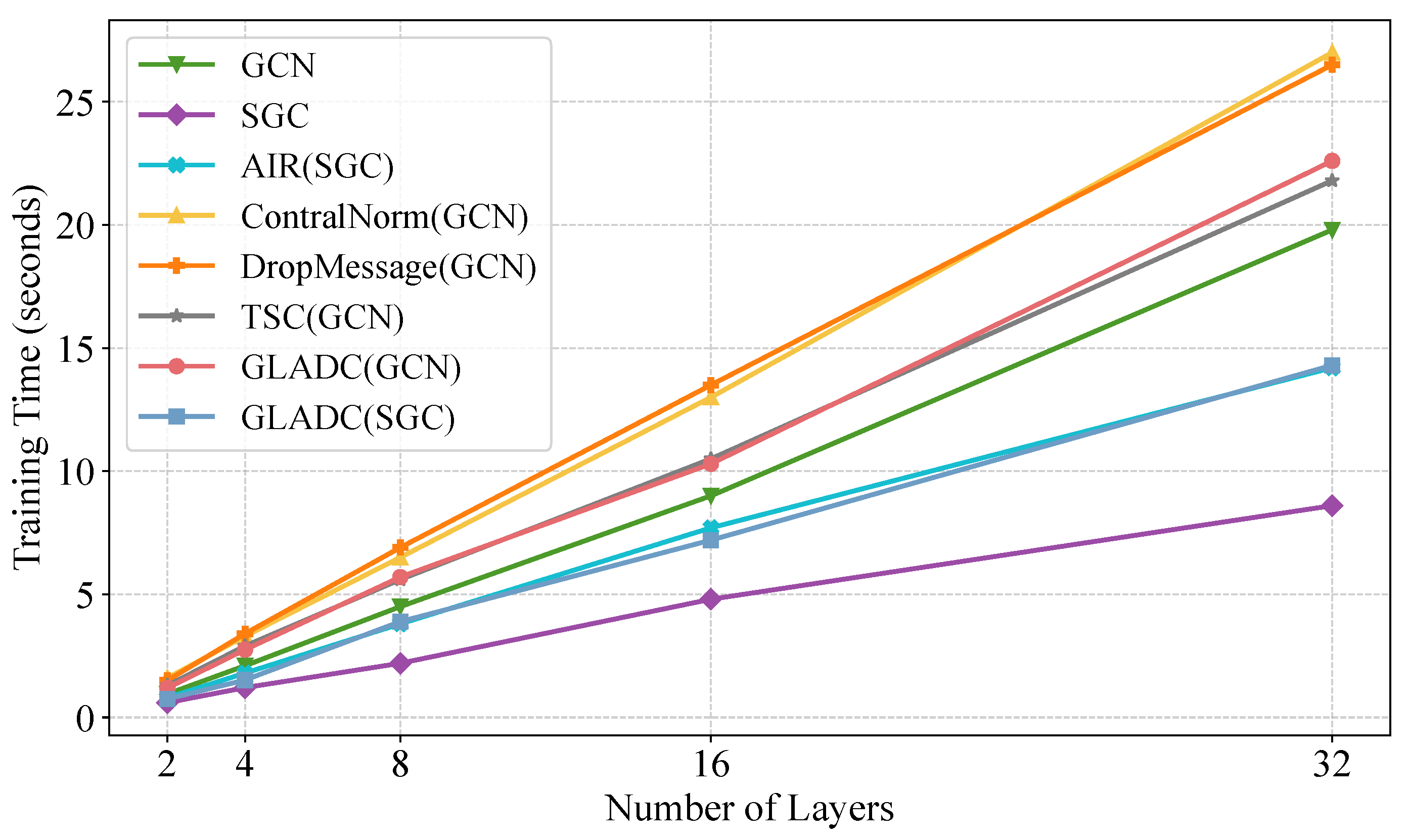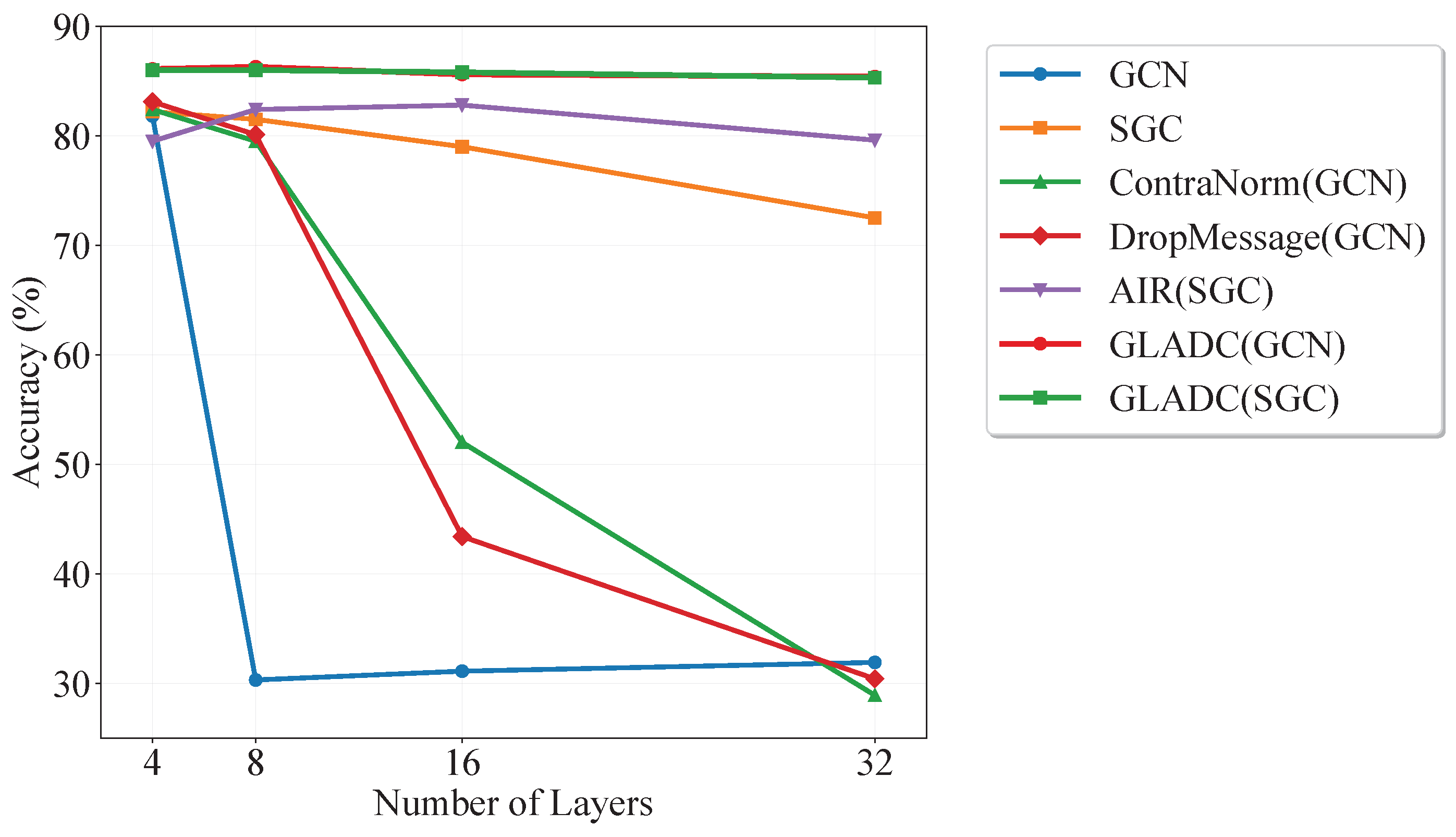 - Extensive experiments on multiple real-world graph datasets demonstrate that GLADC significantly alleviates over-smoothing, prevents performance degradation in deep architectures, and achieves state-of-the-art performance on multiple real-world graph datasets.