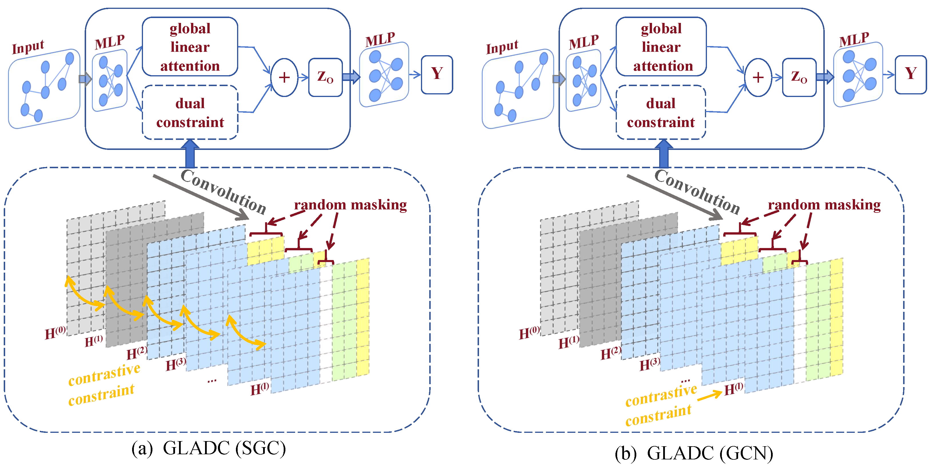 - We propose GLADC, a novel scheme that integrates global linear attention and dual constraint to achieve efficient long-range modeling while effectively resisting over-smoothing.