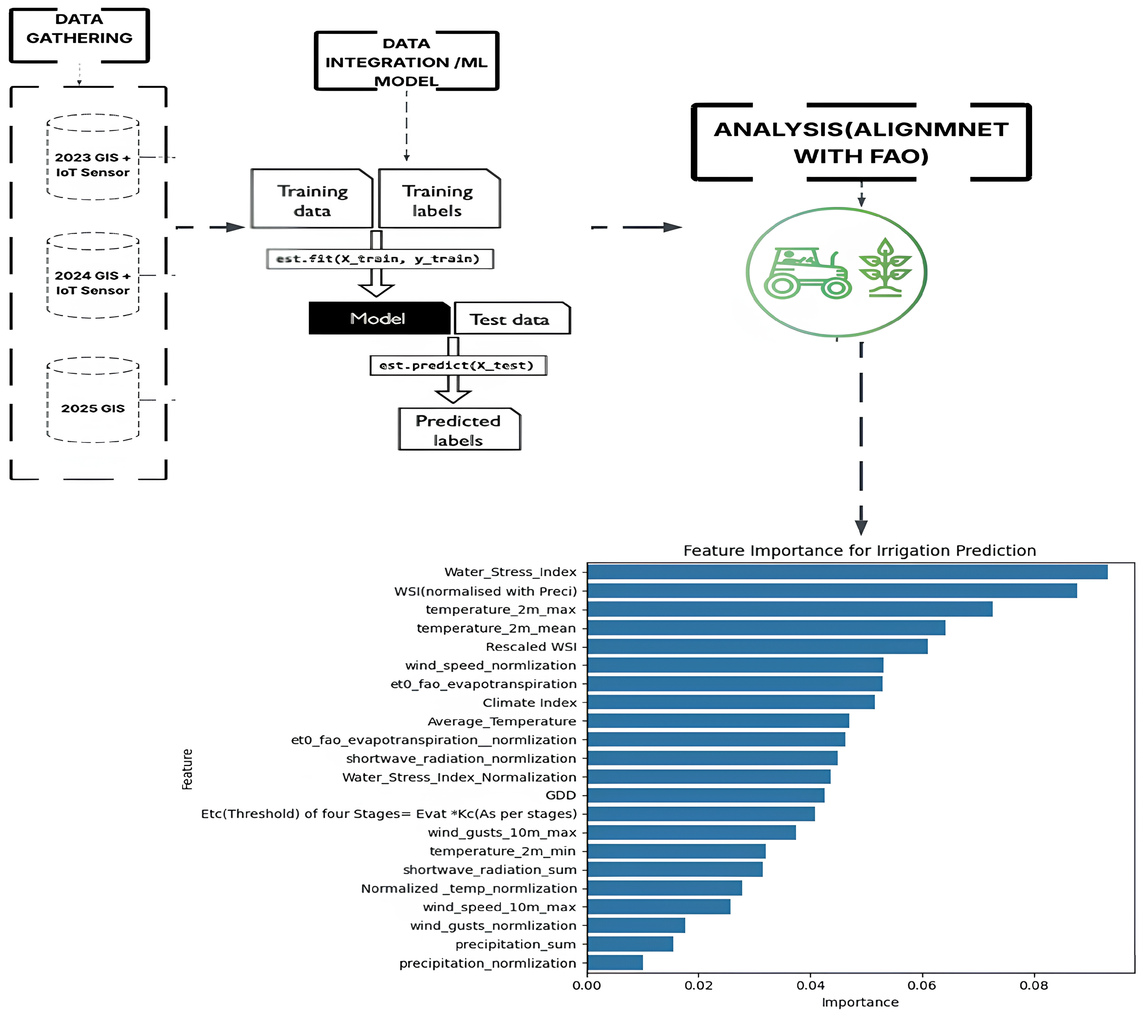 | 10. | Predict irrigation label: ŷ_test = Model.predict (X_test); ŷ = {1, if WRt > 0; 0, otherwise}. |