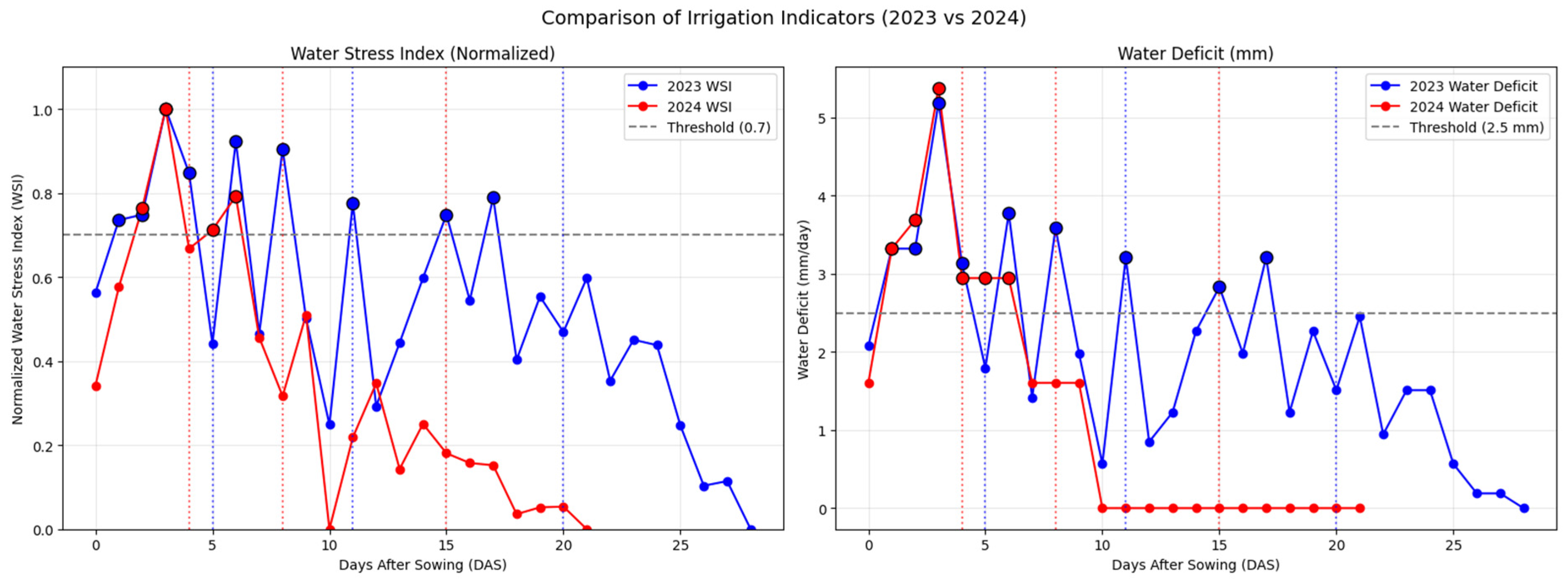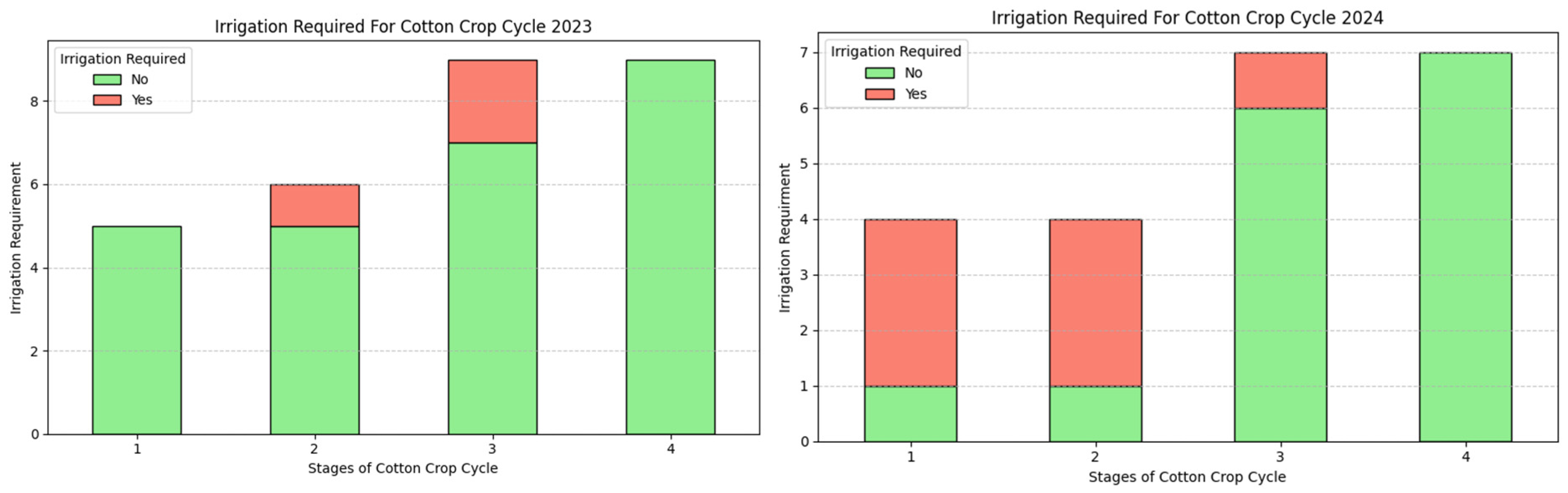 | Yield Effects and Water Use Efficiency (WUE) | 2023 implies higher yield risk and lower WUE; 2024 likely better WUE due to fewer stress episodes after early stage. | Studies show that deficit irrigation may slightly reduce yield but improve WUE if applied outside the flowering/bolling stage [24]. | Consistent: 2024 likely higher WUE, 2023 higher risk. |