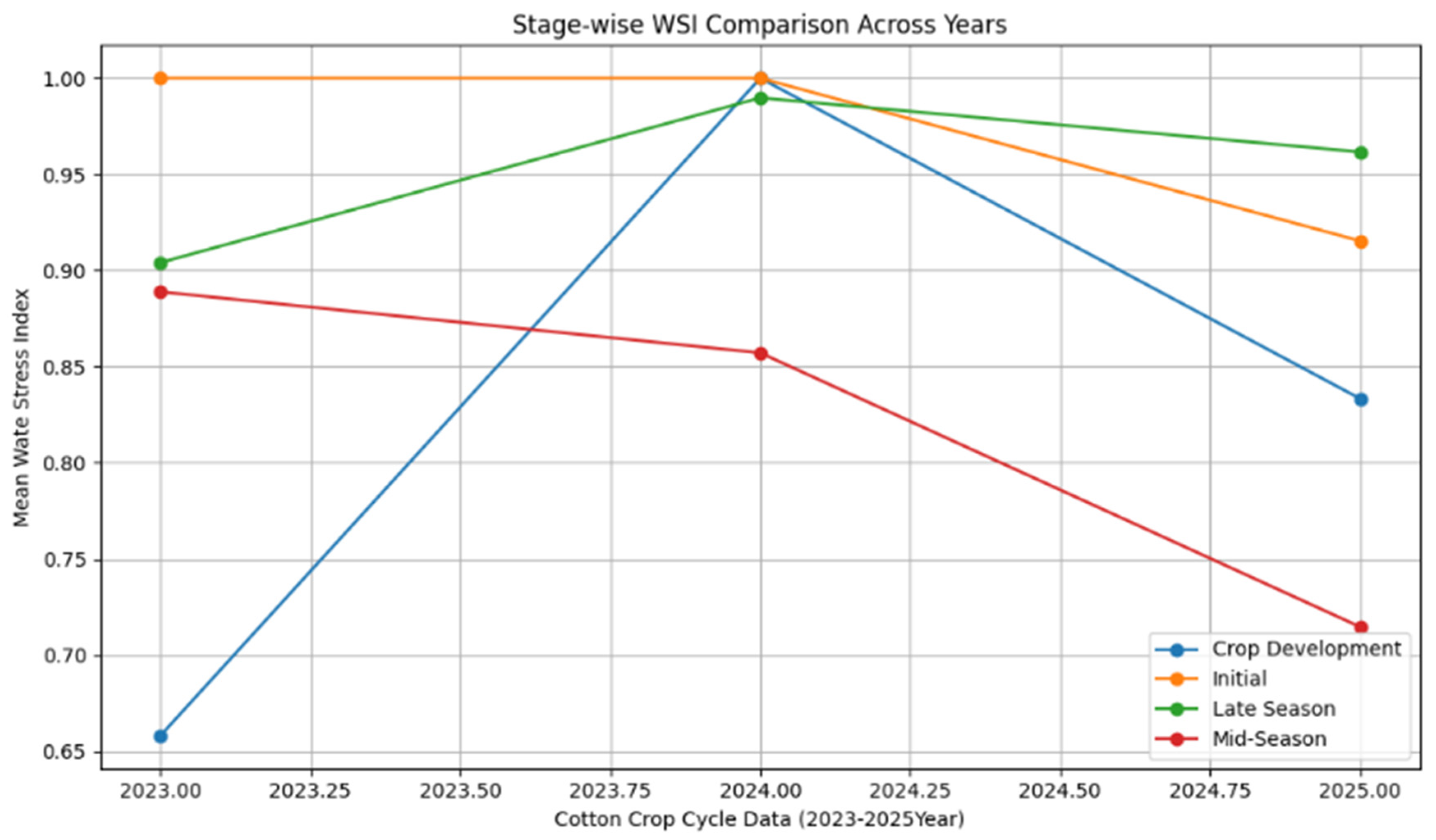 | Late Season (30–40 days) | Kc = 0.65–0.70. Water needs decline but still required for boll filling. Deficit reduces ball weight. | Mean Etc ≈ 3.0 mm/day. WSI ≈ 0.90–0.99 all years (persistent stress). | Results align. Model confirms continued water stress; supports FAO statement that late-stage irrigation is important for boll maturity |