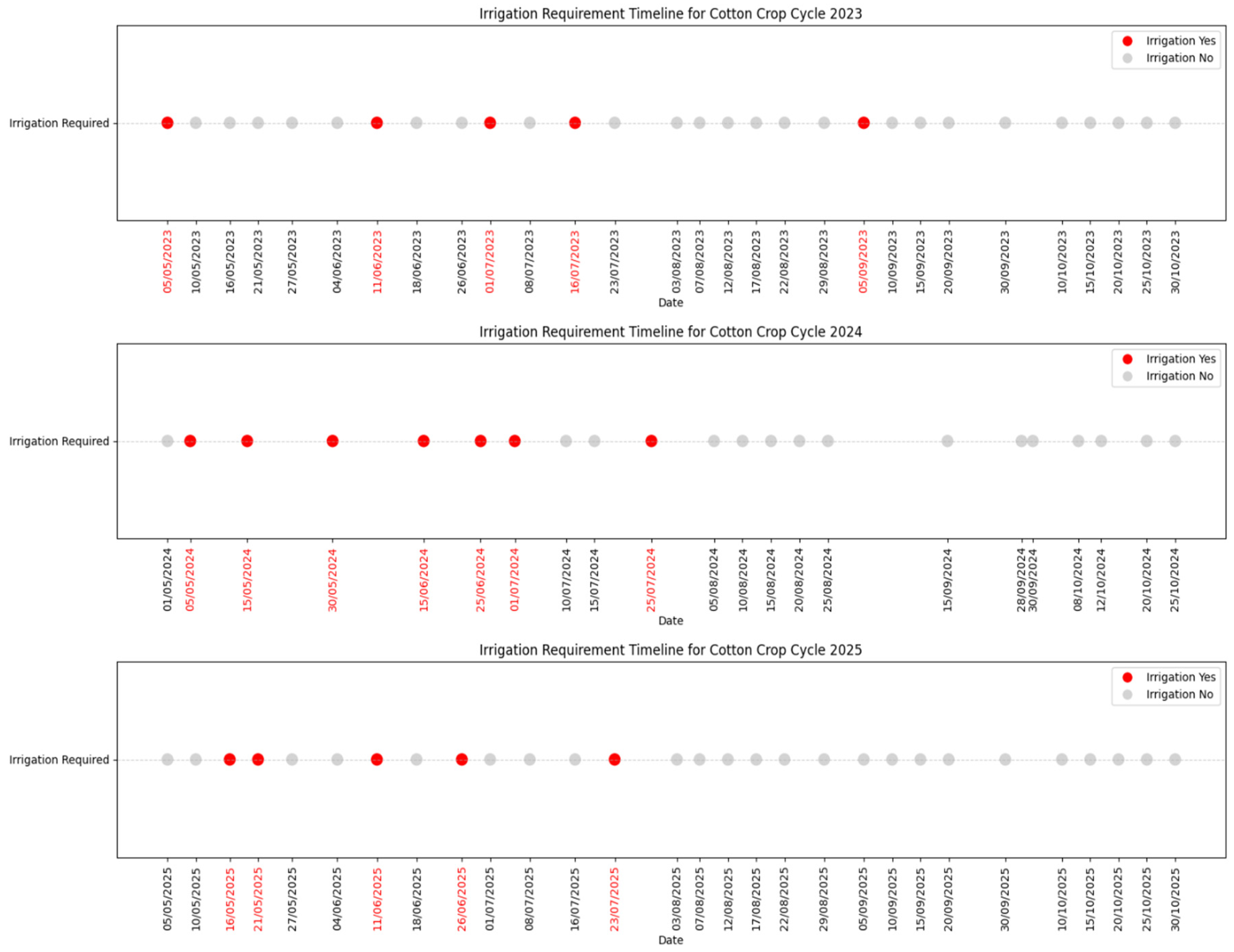 | Mid-season: | Peak water demands. Irrigation frequency should be highest here (7–10-day intervals or as ET dictates). Stress at this stage causes large yield penalties. FAO/Kc guidance is crucial. | Partial. 2023 GIS shows mixed results: many fields irrigated but some had gaps (depending on local water availability). Overall, it is closer to FAO than 2024/2025. | Partial. 2024 has a notable gap in August in the provided timeline (irrigation events decline), indicating under-irrigation in a critical period. | Partial: ML model predicted limited mid-season irrigations. |
