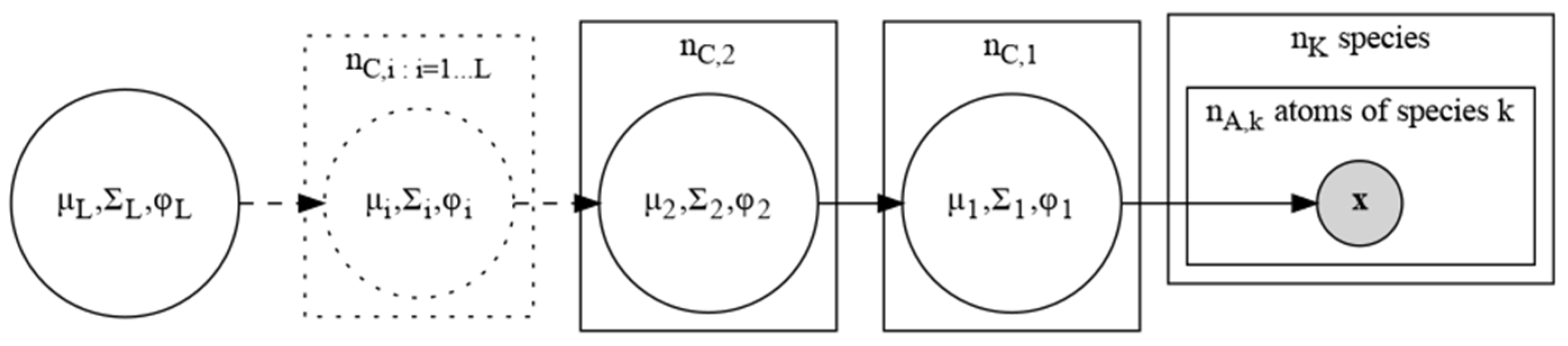 We can determine whether a particular child entity/cluster belongs to a particular parent entity/cluster via inference, a procedure to fit the HMGC model’s parameters to the data (atoms) that determines entity memberships. The virtues of HMGC are simplicity, versatility, and adaptability, requiring zero externally adjusted parameters (except perhaps the initial conditions) and perhaps a near-optimal trade-off between simplicity and accuracy. Crucially, not only do the location, size, and orientation of blobs require no parameter adjusting, but neither do the number of blobs at each level and even the number of hierarchy levels (the minimum number of levels is one). This is important because by penalizing “idle” parameters that make little contribution to model accuracy, inference automatically selects the number of levels and blobs at each level, which is a sort of statistical model selection [