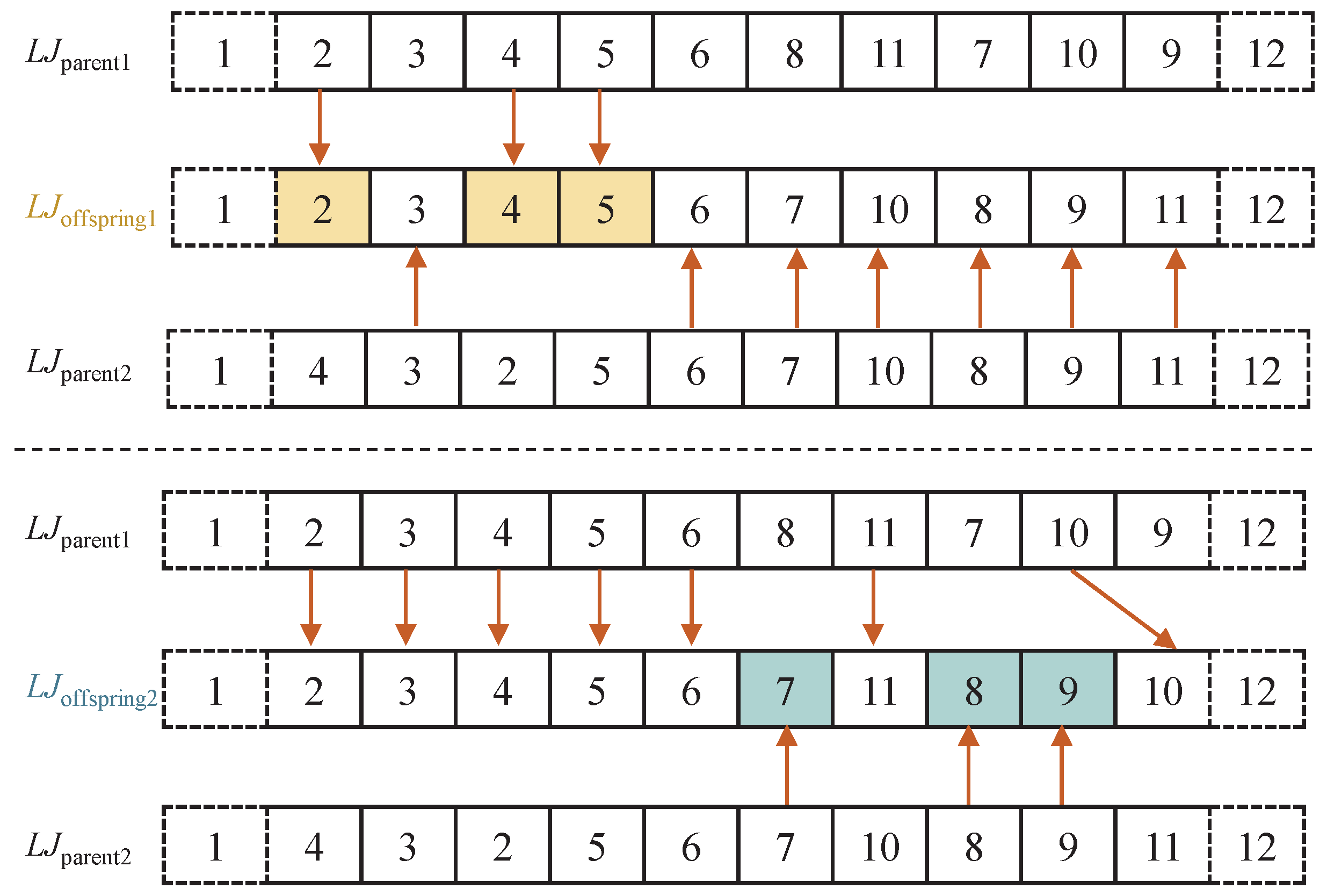 The encoding of MNSGA-II solutions employs real-value coding and primarily includes the task execution list S and execution mode list M. The initial solution is randomly generated. In the task execution order S, the first and last elements accommodate dummy tasks, while the remaining tasks are randomly inserted into S. In the execution mode list M, each element represents a specified mode selected from a set of modes for the corresponding task.