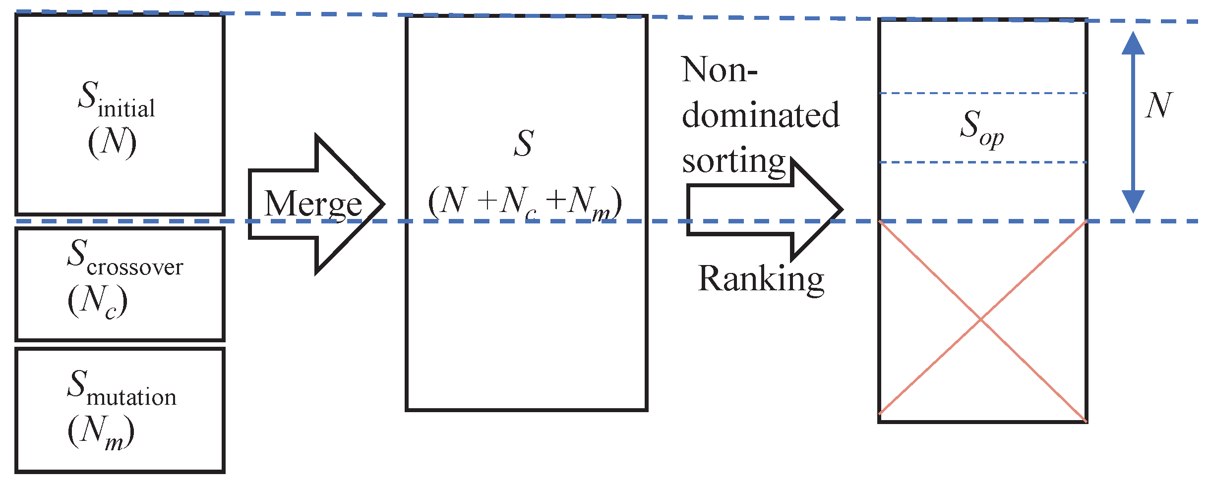 To overcome these challenges, this study proposes a mode-oriented Non-dominated Sorting Genetic Algorithm II (MNSGA-II) with two key innovations: (1) A novel mode-repair mechanism during initialization that ensures feasible, high-quality starting solutions, and (2) Specially designed neighborhood structures for both mode and task lists that enable comprehensive local search. The procedure of the MNSGA-II is shown in