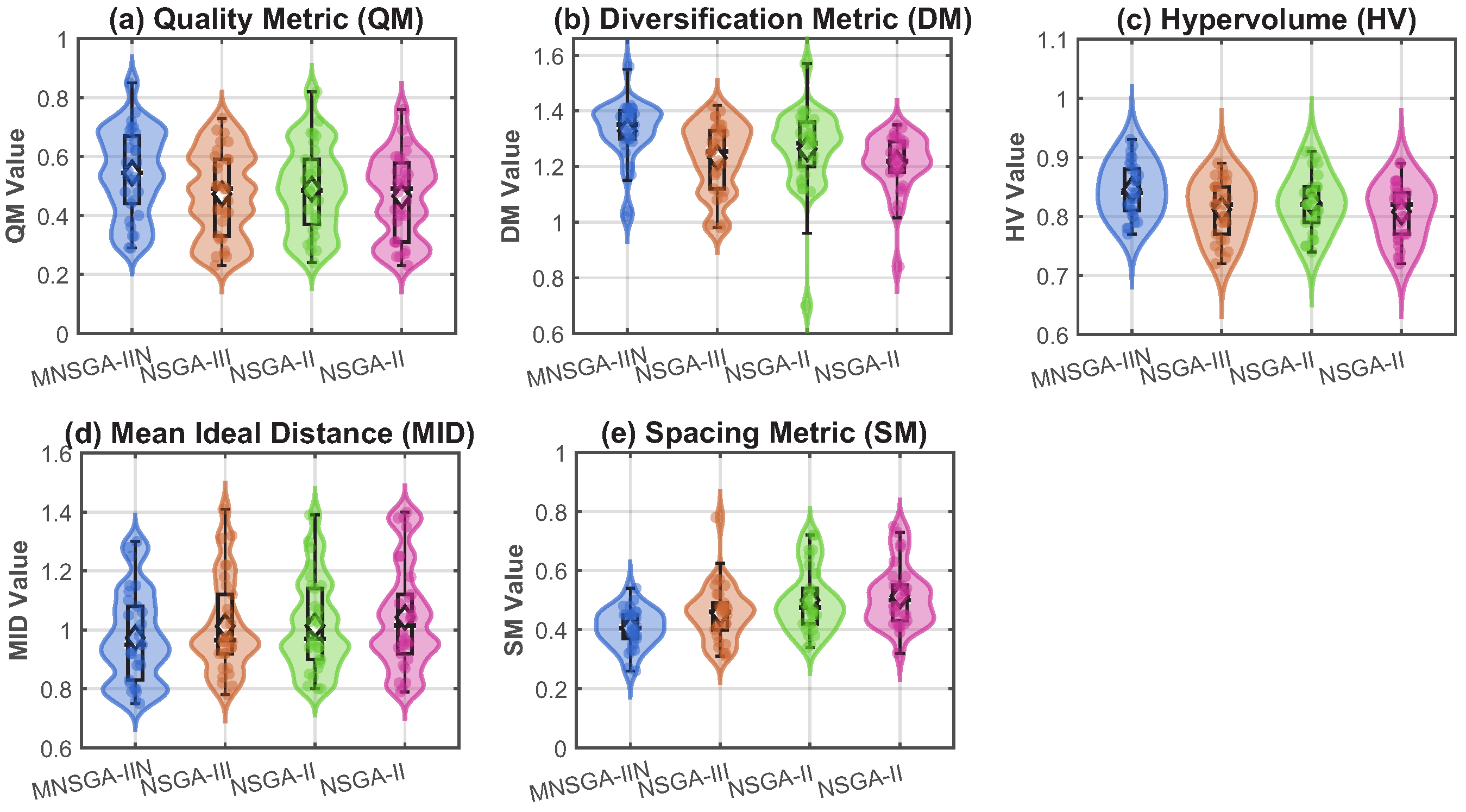 SM Values of MNSGA-II, NSGA-III, SPEA-II, U-NSGA, and F-MOIWO.