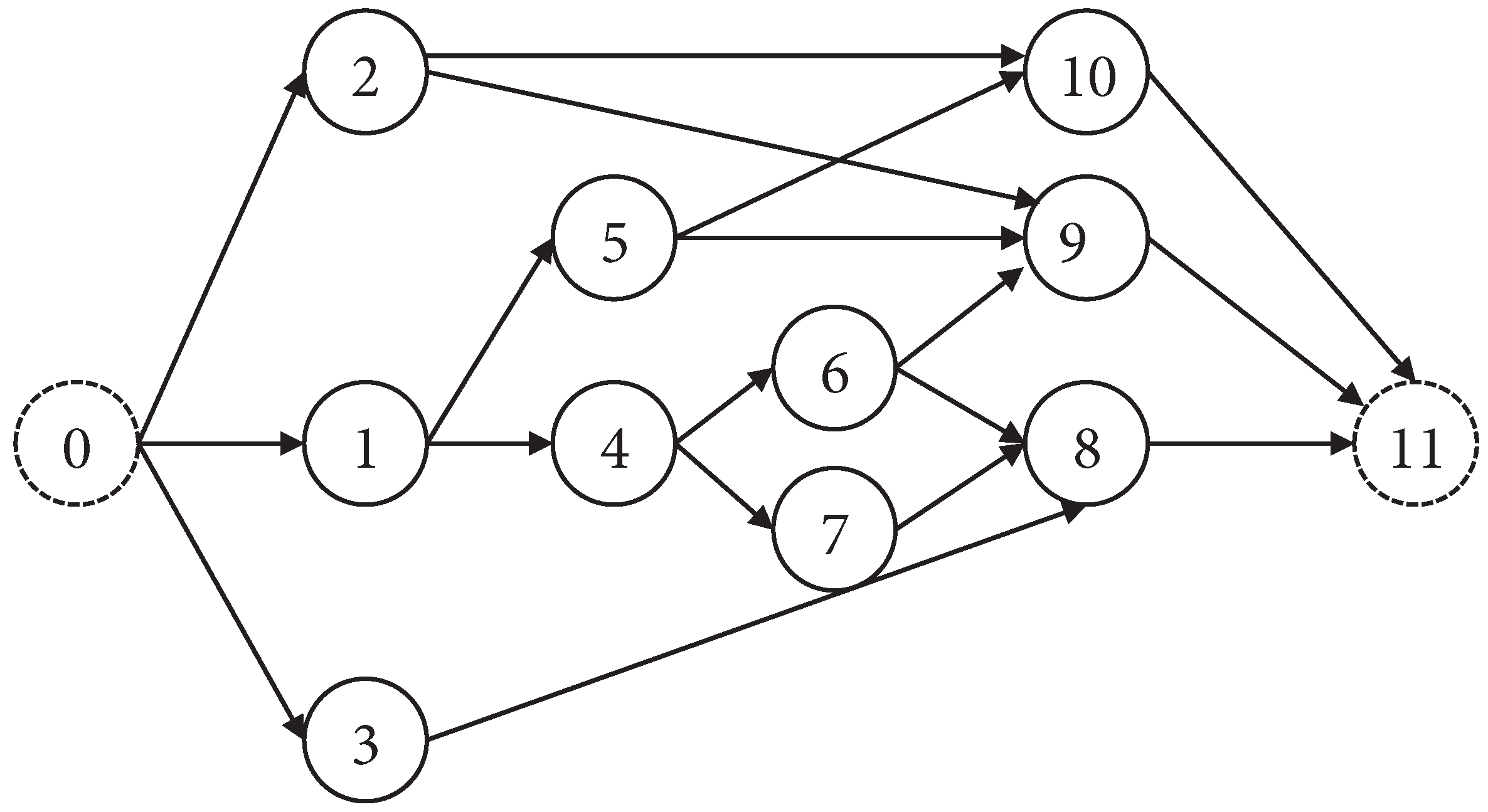 The project consists of multiple tasks , following precedence relationships where task i cannot start until all its immediate predecessor tasks are completed. Each task i can be executed in mode , where mode m has a duration of , requires units of renewable resource k, and units of non-renewable resource n. The first and last tasks are dummy tasks that represent the start and end of the project and do not consume time or resources. Since the resource amounts, time, and cost are different for each mode, the optimal mode is selected based on the task requirements and resource combinations to determine the task schedule and minimize resource consumption costs. A feasible task schedule must always satisfy the following constraints: (1) The total consumption of non-renewable resources for all tasks cannot exceed their predefined total limits ; (2) The total consumption of renewable resources for each task in time period t cannot exceed their predefined capacities ; (3) Each task must complete its immediate predecessor tasks before it can start.