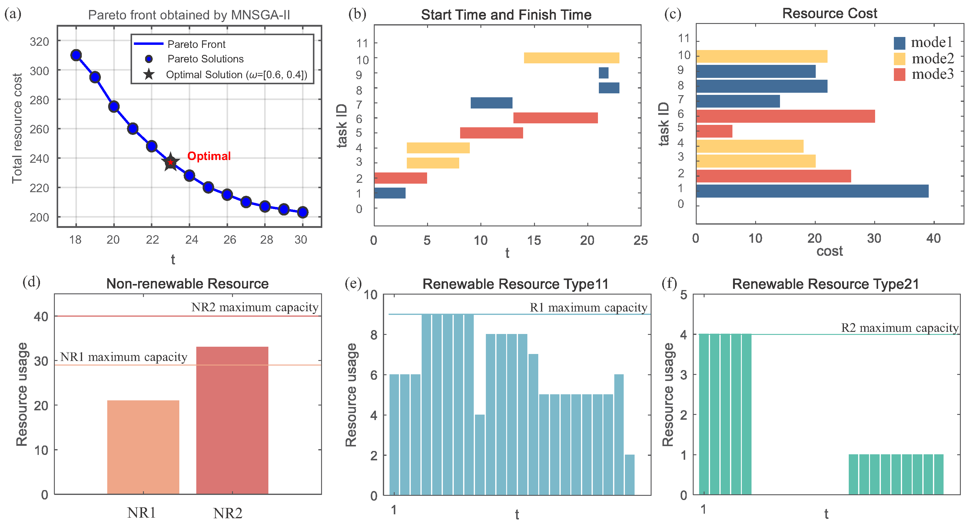 A mode-oriented Non-dominated Sorting Genetic Algorithm II, featuring (a) a mode-repair mechanism ensuring feasible initial solutions, and (b) four novel neighborhood structures for granular solution refinement, is designed. Unlike prior repair strategies that enforce feasibility through backtracking, our mechanism directly adjusts modes via greedy resource reallocation, reducing repair complexity. For the proposed NS1-NS4, the problem-specified knowledge is incorporated, which greatly enhances the performance of the general algorithm framework.