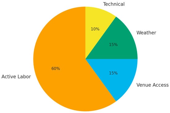 Per-kiosk breakdown of active labour and delays. Pie chart showing the proportion of time attributed to active labour, venue access, weather, and technical/networking issues. Active labour accounted for ~60% of the time, while weather and venue access contributed 30%. Technical and networking issues accounted for only 10%, indicating that predictable, recurring disruptions were the dominant causes of delay.