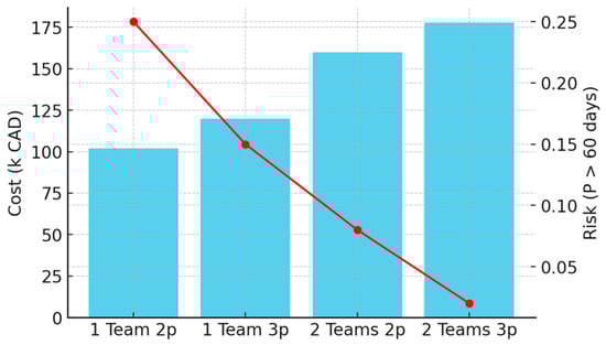 Cost–risk trade-off across four deployment strategies. Bar heights indicate total project cost (in thousands of CAD), while the overlaid line shows the probability of exceeding a 60-day rollout target. The single-team, two-person strategy (leftmost) is the least expensive but carries the highest risk of delay (~25%). Adding a third person significantly lowers the risk with only a modest increase in cost. The two-team, three-person model (rightmost) achieves near-perfect on-time rollout (>98%) but at the highest cost, illustrating the trade-off between operational feasibility and resource investment.