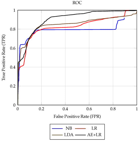 For CICIDS2017, Figure 2 confirms that LR, LDA, and AE+LR all operate in a near-ceiling regime, with ROC curves that are almost indistinguishable (AUC for LR and AE+LR; Table 6 and Table 7). NB, in contrast, traces a noticeably lower ROC curve, reflecting its higher FAR and reduced Precision despite very high Recall. Overall, once the feature space is well separated, the additional non-linear representation from AE does not translate into a visible ROC advantage over LR on this benchmark, even though AE+LR still matches LR in AUC.