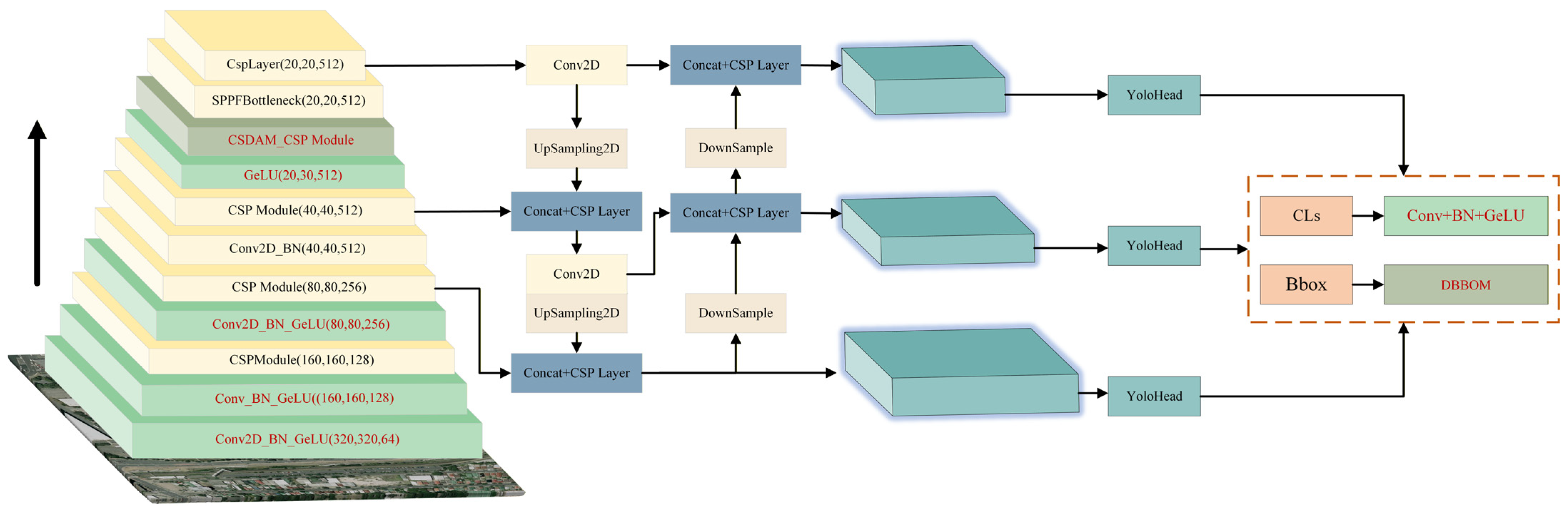 Backbone: The backbone is responsible for extracting multi-level feature representations from input images. This algorithm adopts a CSPDarknet-based structure as its foundation, integrating CSDAM and GeLU to enhance its feature extraction capabilities. The network input size is 640 × 640 × 3. Through convolution and downsampling operations, it progressively generates feature maps at different scales (e.g., 160 × 160, 80 × 80, 40 × 40, and 20 × 20), providing foundational features for subsequent multi-scale detection.