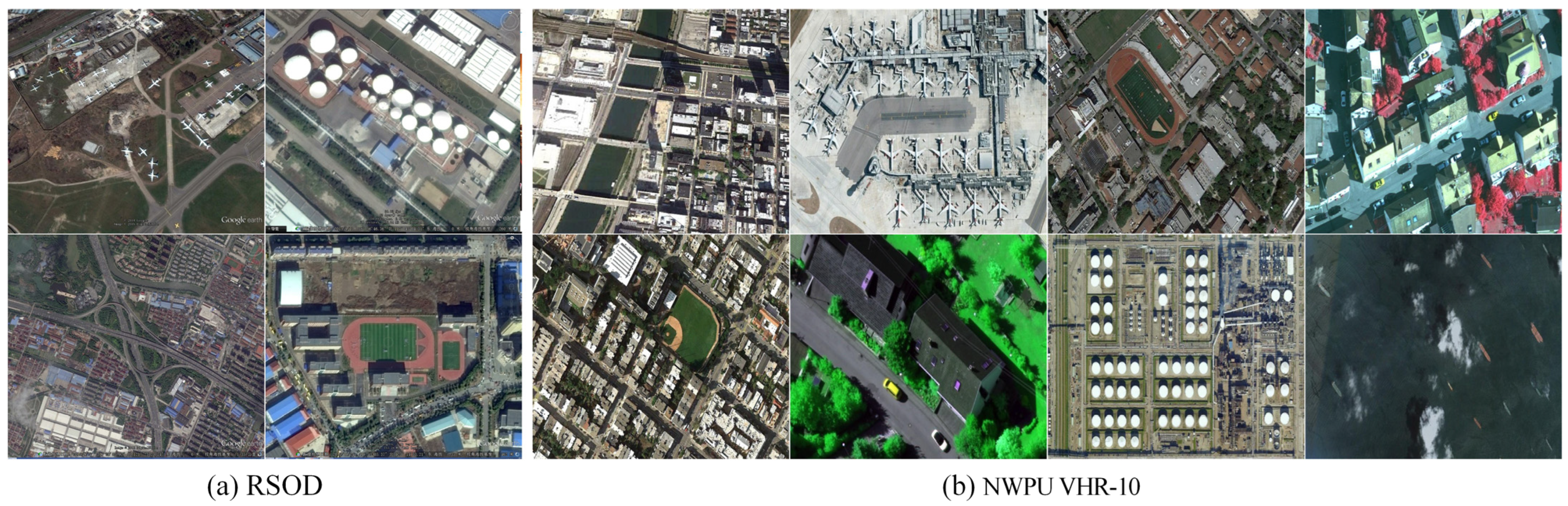 Figure 6 shows sample remote sensing images from both datasets, visually illustrating the characteristics of typical ground objects such as aircraft, oil tanks, overpasses, and playgrounds in remote sensing imagery. Together, the RSOD and NWPU VHR-10 datasets provide essential support for remote sensing object detection research—the former focuses on the fine-grained detection of specific categories, while the latter offers broader category coverage and scene diversity.