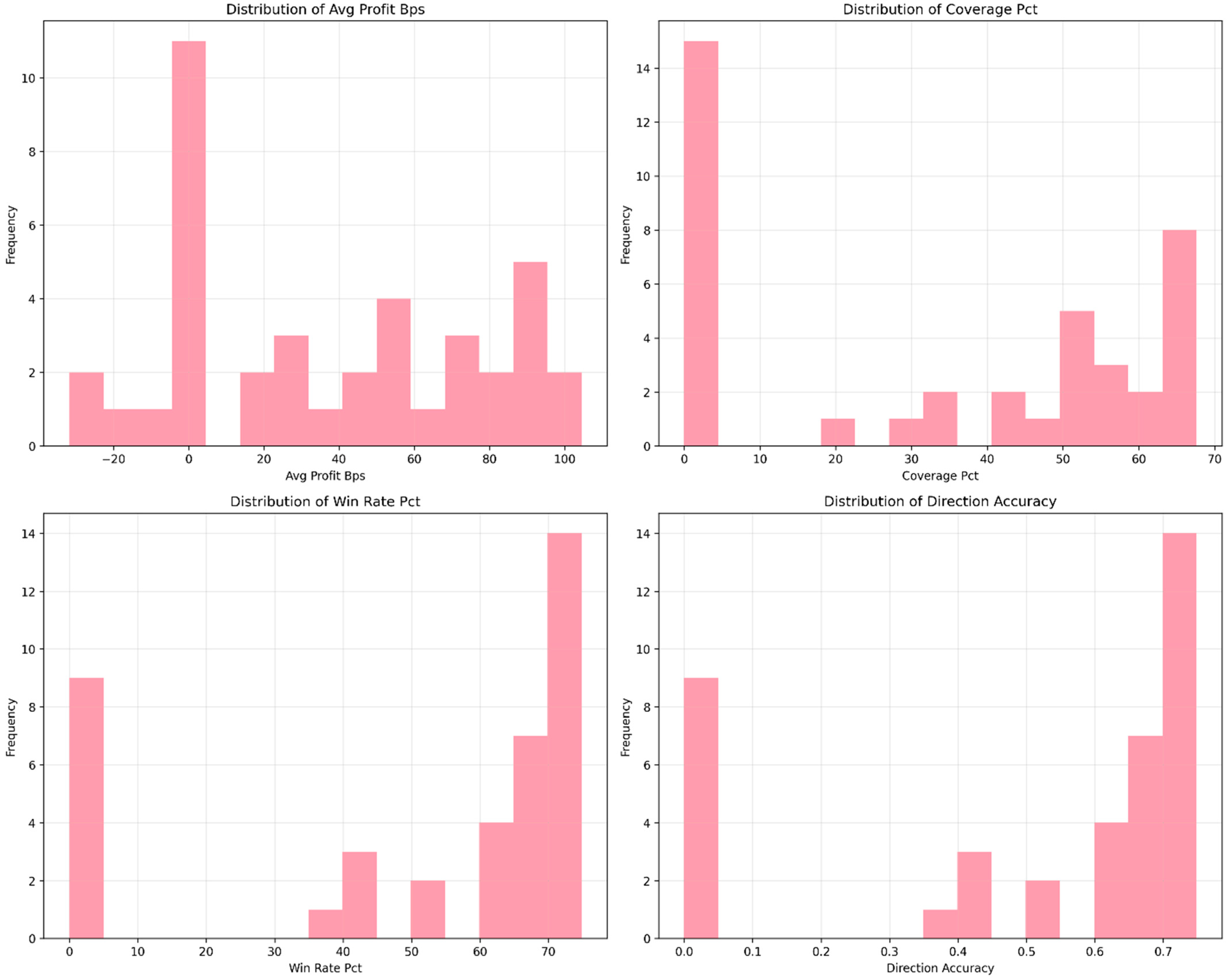 The coverage–profit trade-off reveals fundamental economic constraints in cryptocurrency markets. High confidence strategies sacrifice 82% of trading opportunities to achieve superior per-trade returns, indicating that genuinely predictable price movements occur infrequently but deliver substantial profits when correctly identified. This finding aligns with efficient market theory while demonstrating exploitable inefficiencies at specific temporal scales.