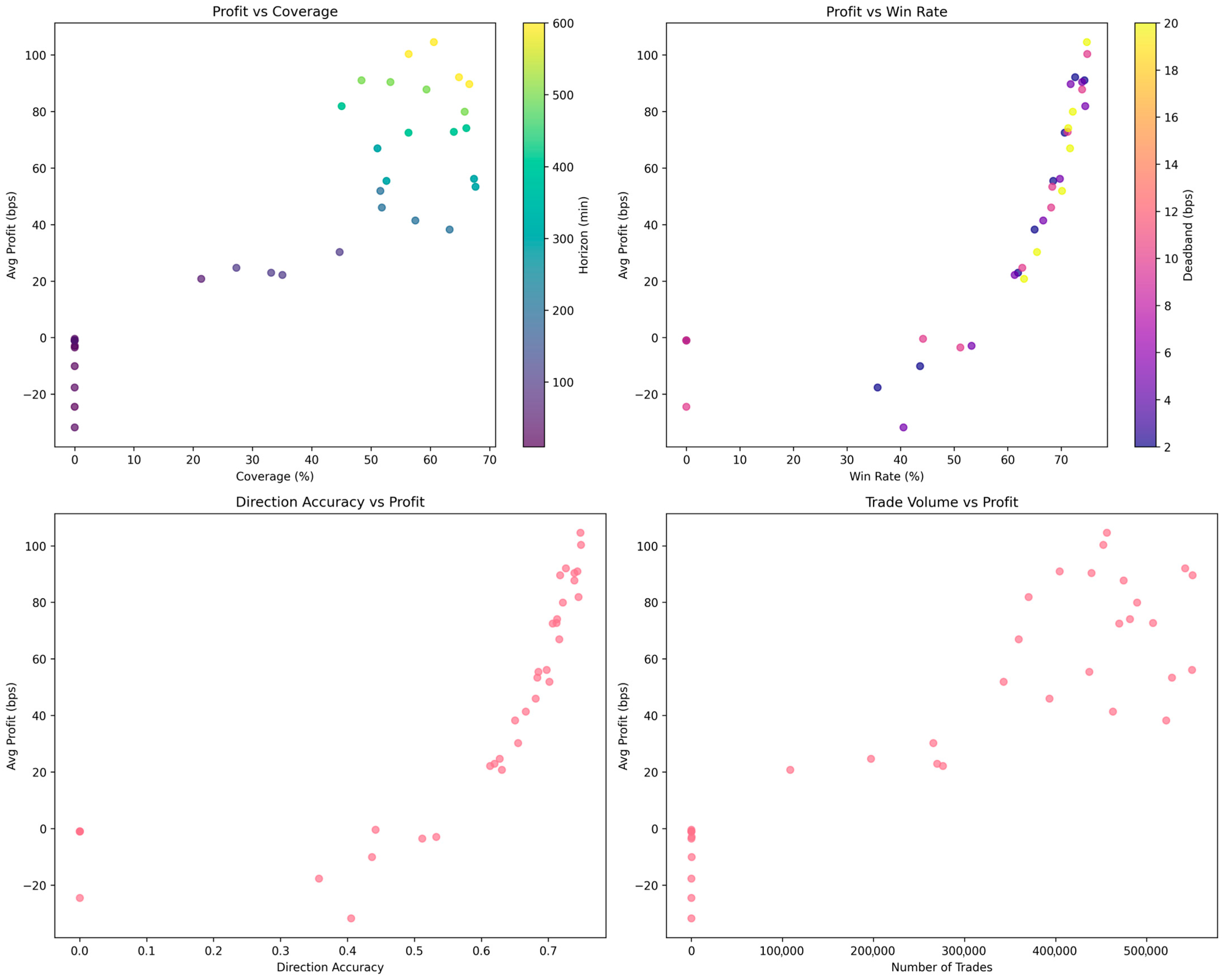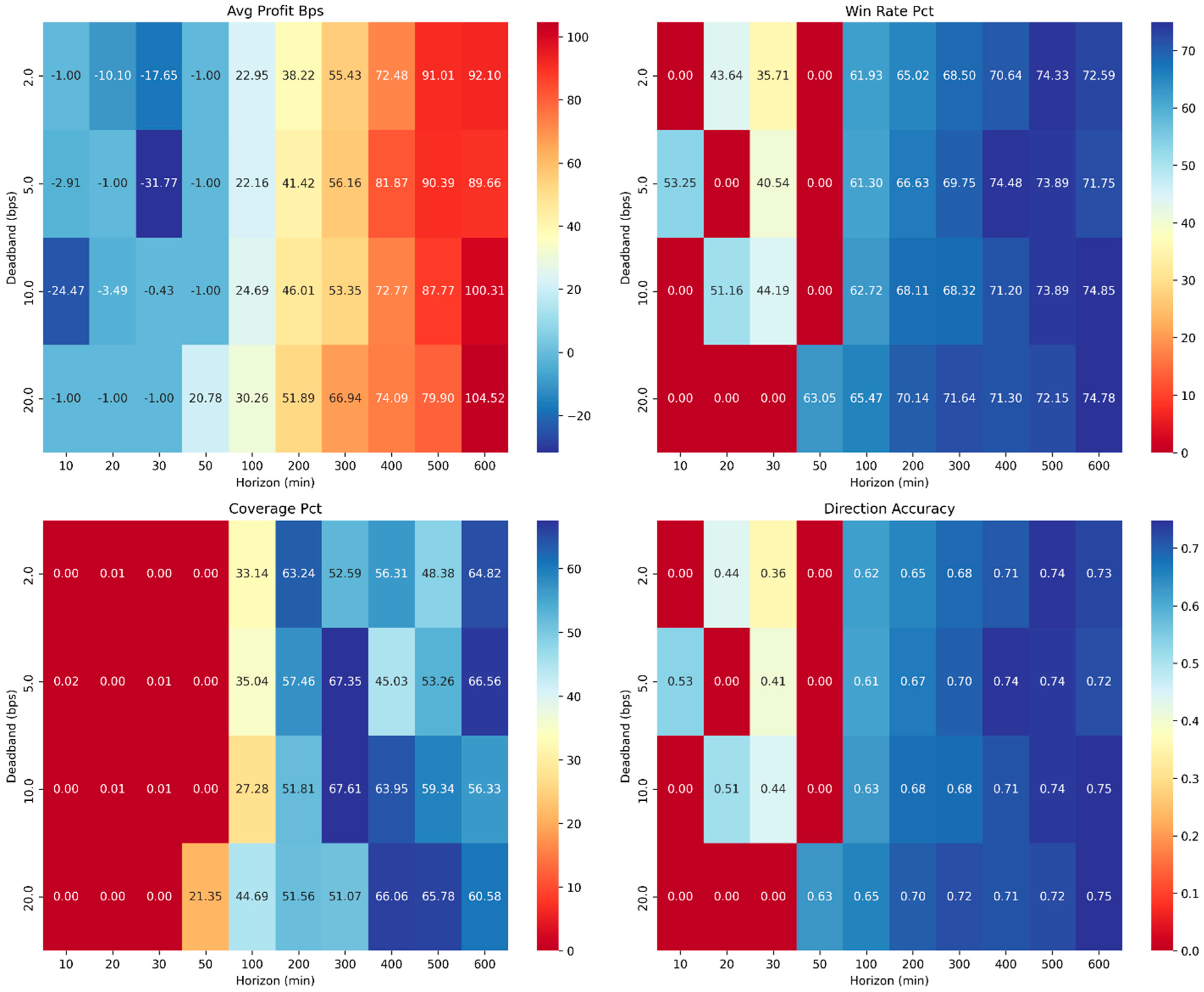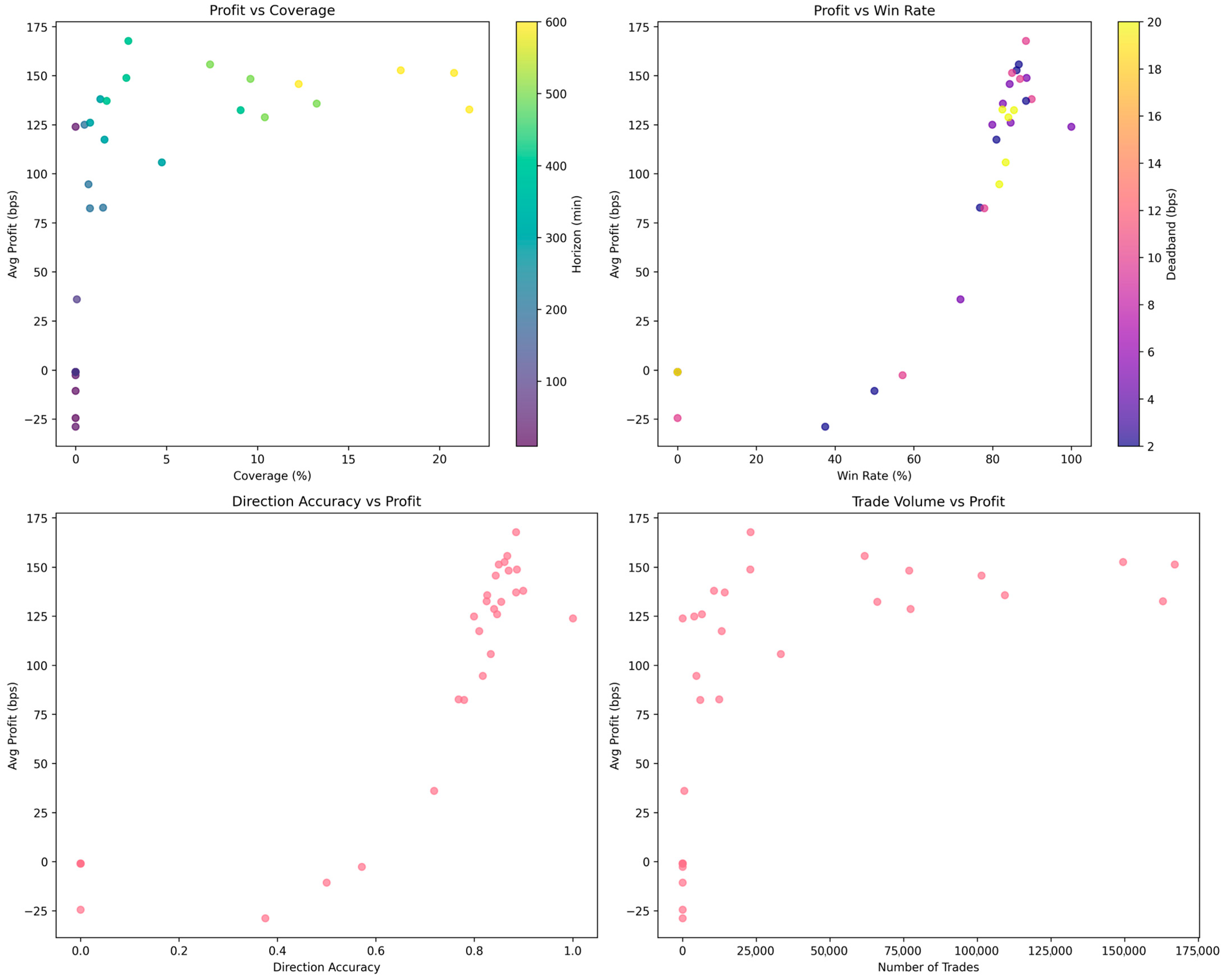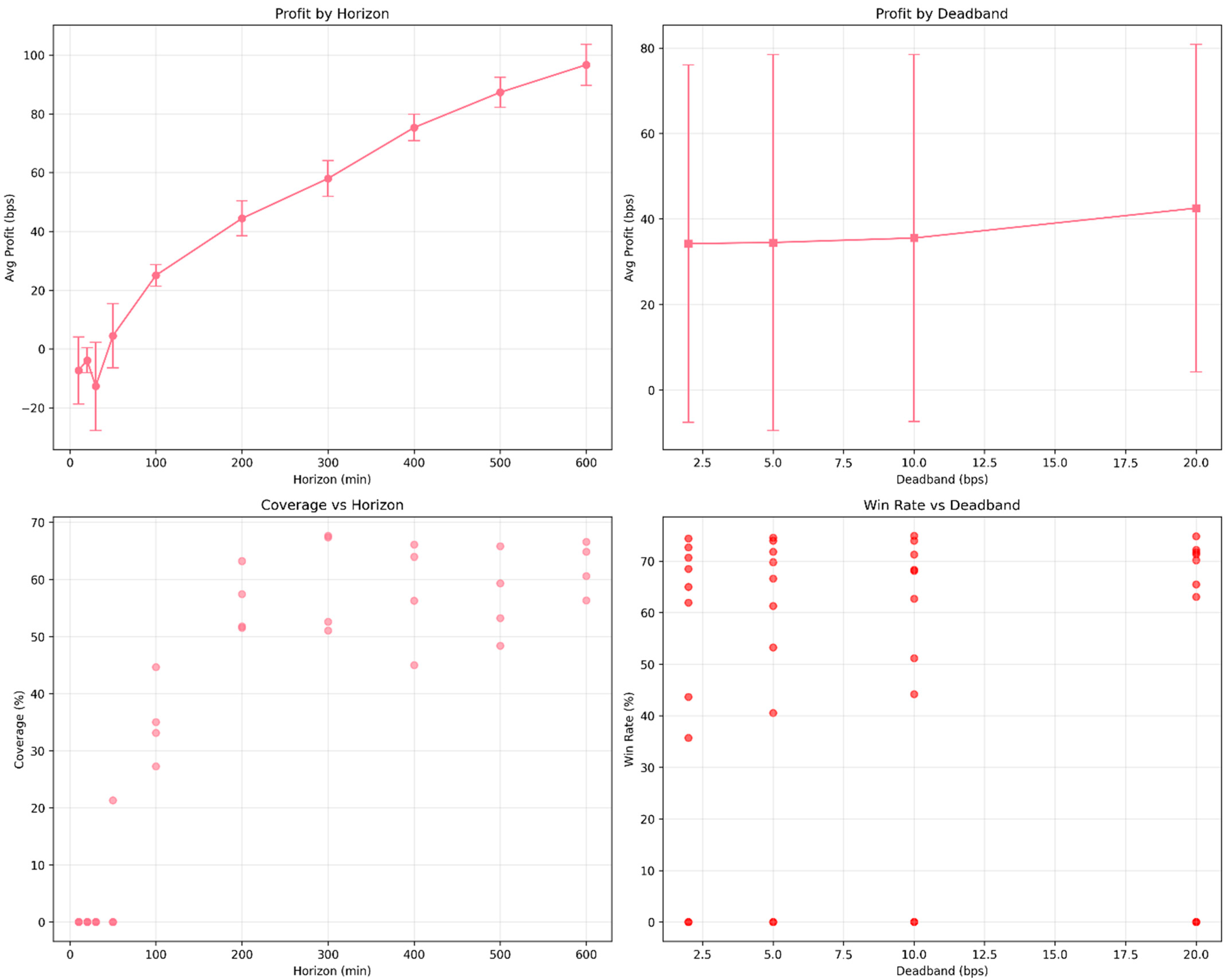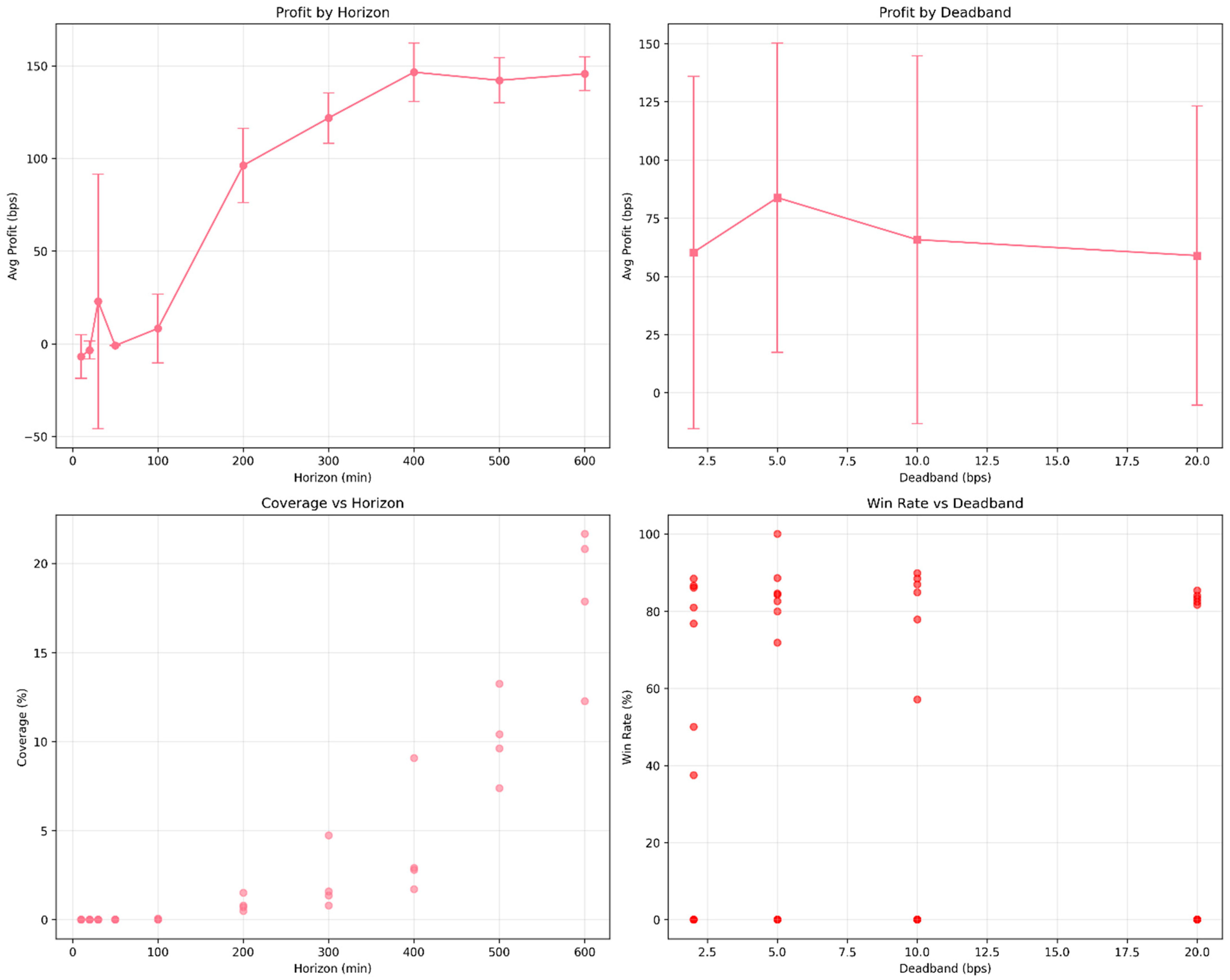 The systematic parameter optimization reveals fundamental trade-offs between trading frequency and signal quality in cryptocurrency markets. Optimal performance occurs at intermediate prediction horizons (400–600 min) where daily momentum trends manifest through intraday order flow patterns. The confidence-threshold mechanism proves critical for economic performance, with high confidence requirements improving profits by 60.4% while reducing median coverage from 44.9% to 0.28% (≈−99%).