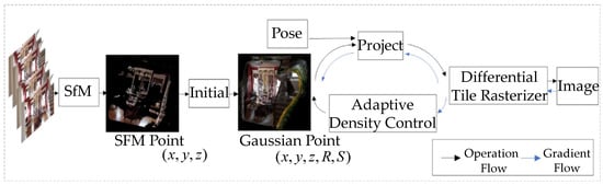 This section discusses the core idea and algorithm architecture of 3DGS and feed-forward 3DGS. The overall structure of the 3DGS method mainly includes the following core modules: motion recovery structure (SfM), 3D Gaussian point cloud initialization, projection transformation, micro block rasterization rendering, and supervision loss calculation. In the training process, the model uses the adaptive density control mechanism to clone, split, and trim the Gaussian points, and gradually improve the reconstruction quality. The overall architecture of this method is shown in Figure 1.